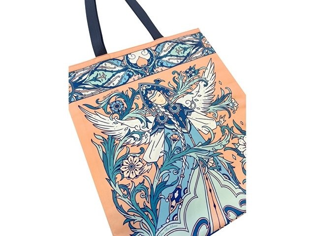 В центре авторского принта — удивительной красоты женщина с белоснежными крыльями, наделенная магическими способностями и житейской мудростью. Оригинальное сочетание тонов, цветочных орнаментов и русского колорита делают аксессуар нежным и самобытным.