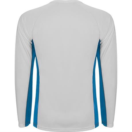 Спортивная футболка из двух комбинированных тканей из полиэстера. Длинные рукава реглан. Основная ткань — bird's eye, а боковые вставки и рукава с внутренней стороны — с микроперфорированной ткани. Круглая горловина с усиленными закрытыми внутренними швам