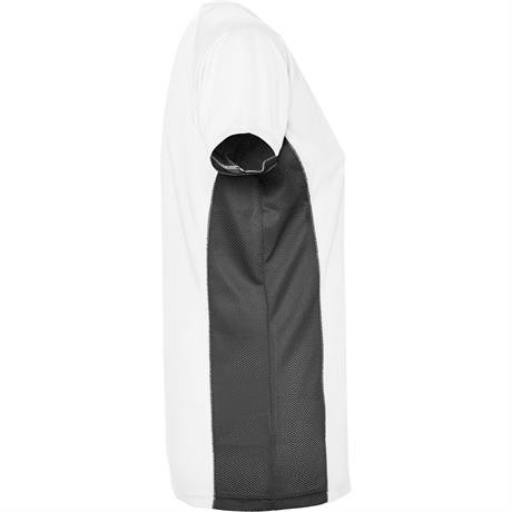 Спортивная футболка с короткими рукавами реглан, изготовленная из двух комбинированных тканей из полиэстера. Основная ткань — ткань bird's eye, а боковые вставки и рукав с внутренней стороны — с микроперфорированной ткани. Круглая горловина с усиленными