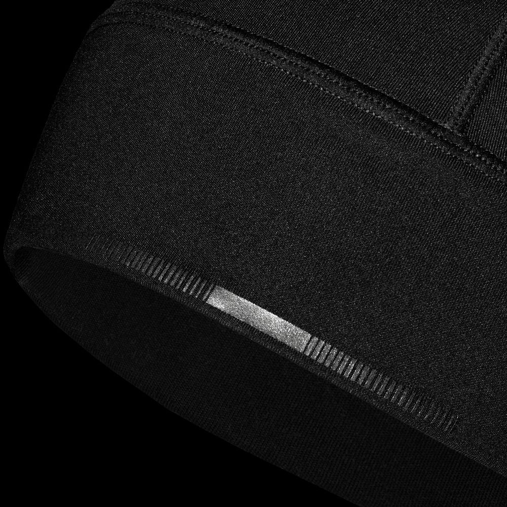 Шапка выполнена в черном цвете, но имеет светоотражающую полосу вдоль края, что улучшает видимость спортсмена в условиях плохой освещенности.