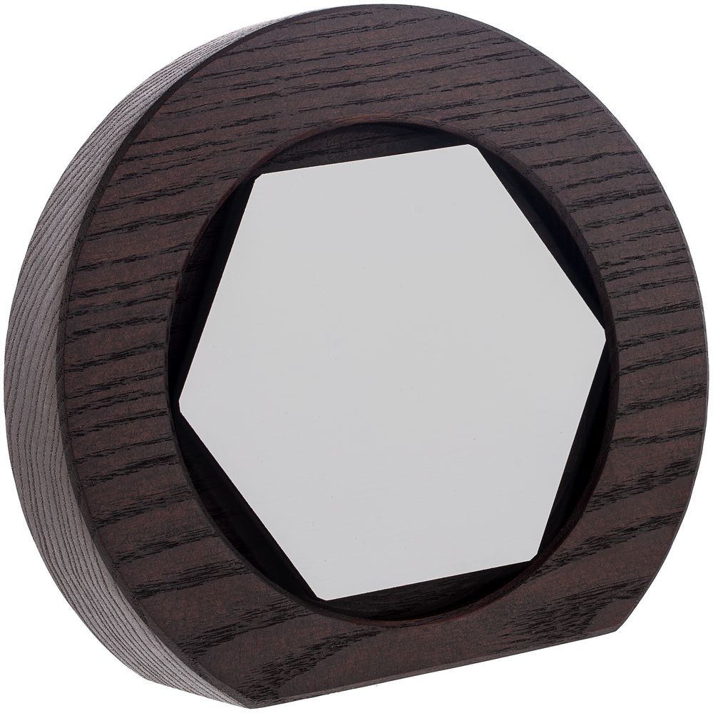 Вставка с шестиграником из зеркального пластика на деревянной основе крепится на приподнятое основание внутри стелы, что создает объем и многослойность награды. На вставке предусмотрен клеевой слой для крепления после нанесения.