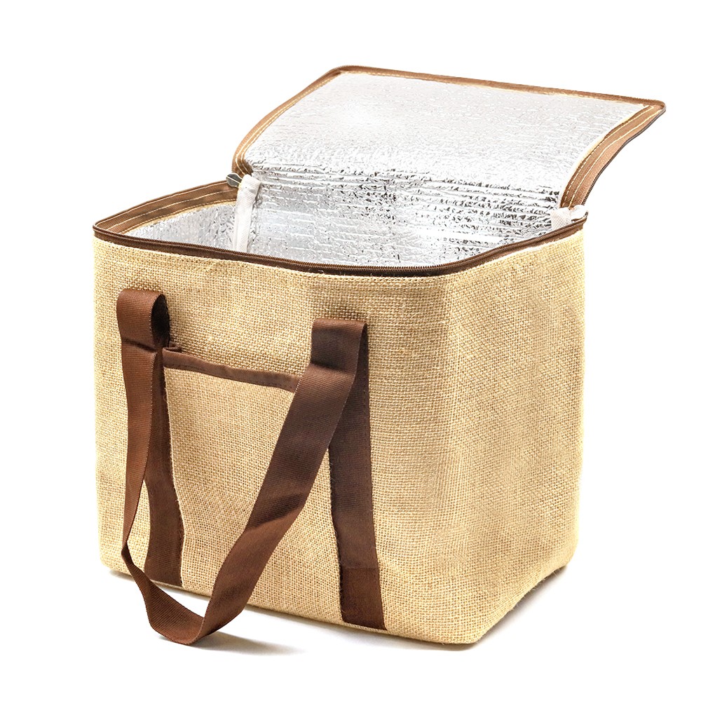 Удобная и вместительная сумка-холодильник из джута позволит взять все необходимые продукты для пикника и сохранит их свежими. Внутренняя часть имеет отделку из алюминиевой фольги, которая защищает содержимое от высоких температур. Закрывается на молнию, что еще больше улучшает изотермические характеристики. Сумка закрывается на молнию и имеет две удобные хлопковые ручки для ношения на плече или в руке. Спереди есть небольшой хлопковый карман для мелких вещей. примерный объем в литрах - 12