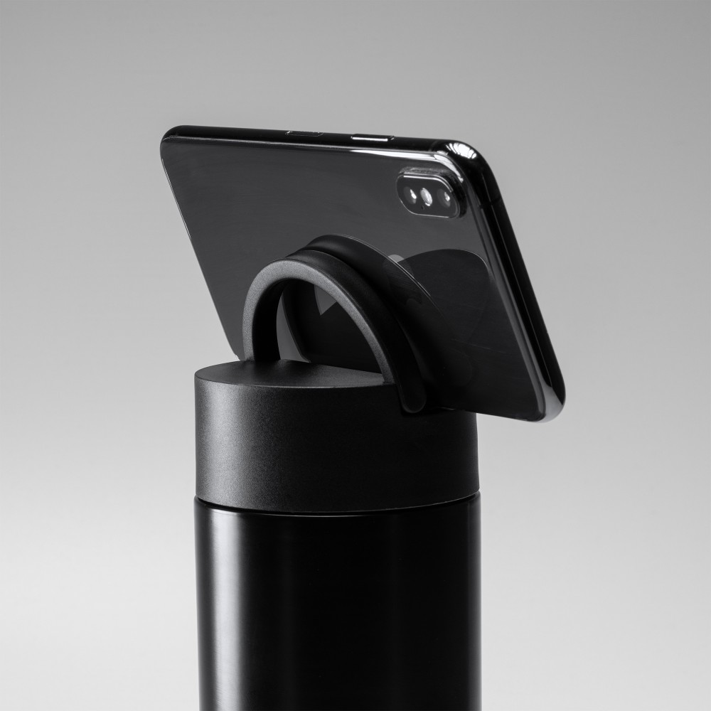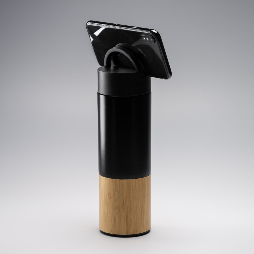 Бутылка с двойными стенками из нержавеющей стали и деталями из бамбука. Идеальная бутылка для сохранения напитков холодными и горячими. Крышка с функцией поддержки ручки, идеально подходит для смартфона. Емкость 450 мл.
