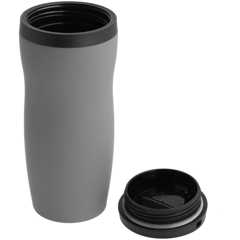Двухслойная конструкция из нержавеющей стали снаружи и пищевого пластика внутри. Герметичная завинчивающаяся крышка с откидным клапаном для питья. Покрытие софт-тач. В отверстие в крышке можно вставить шнурок для удобного ношения стакана на руке. Шнурок в комплект не входит.