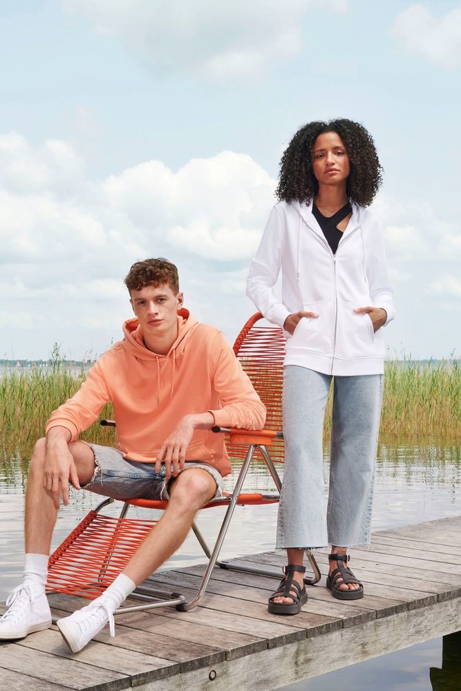 Базовая толстовка унисекс на молнии выполнена из органического хлопка и переработанного полиэстера.