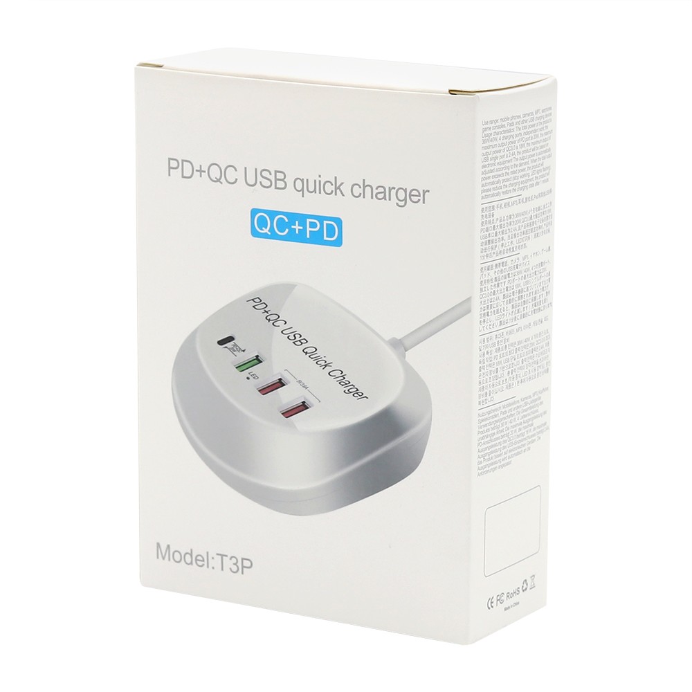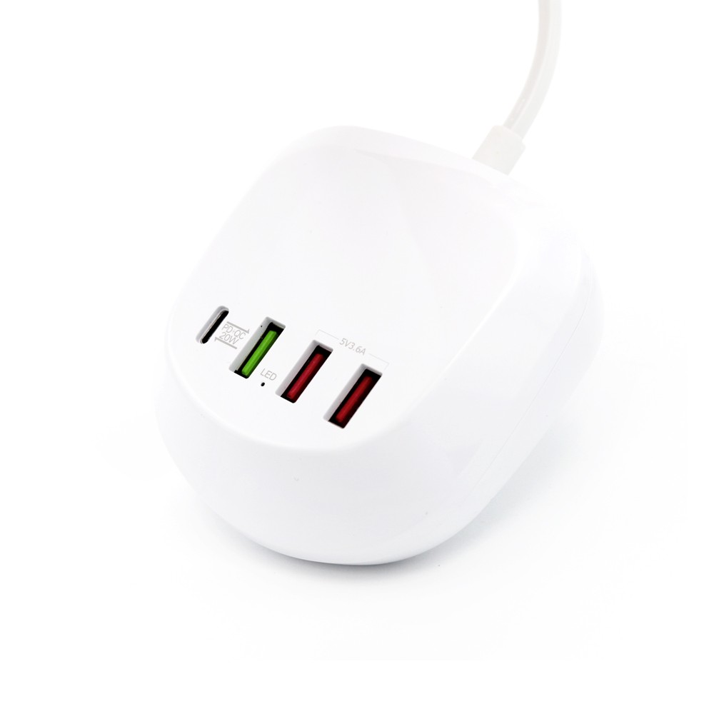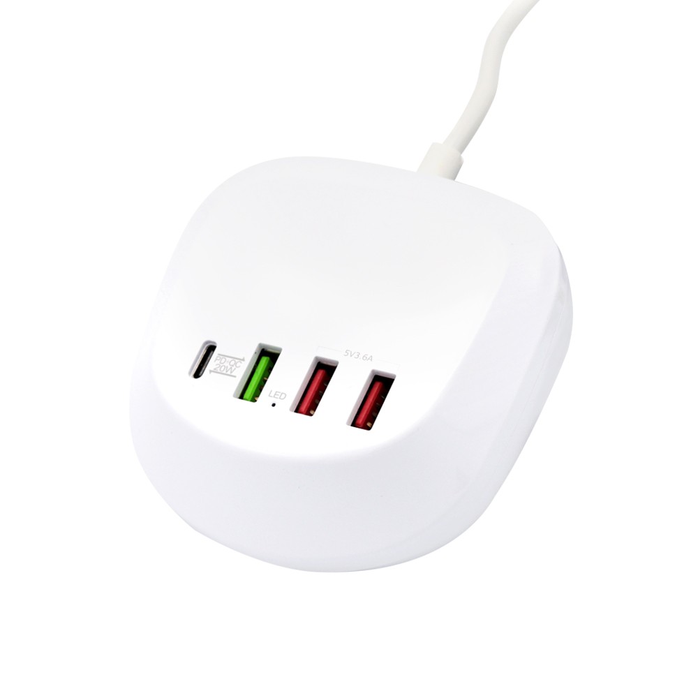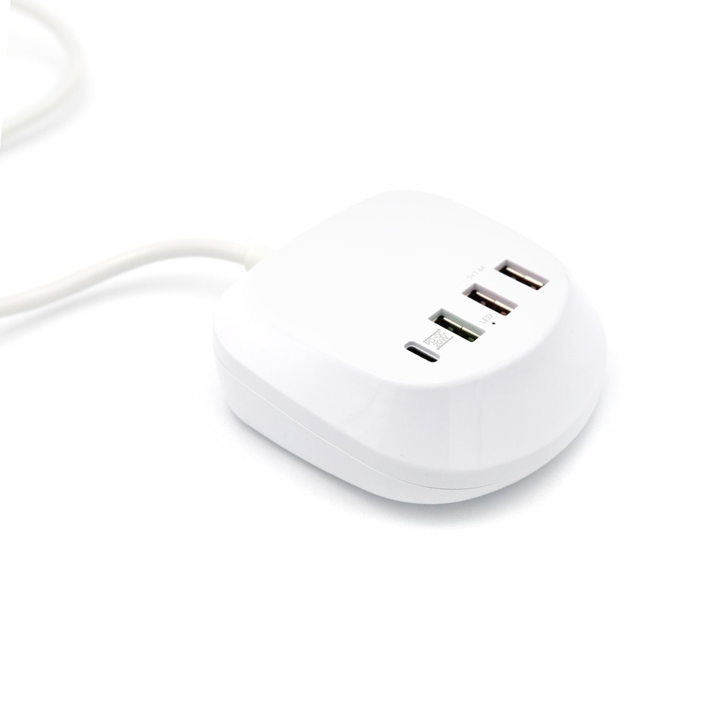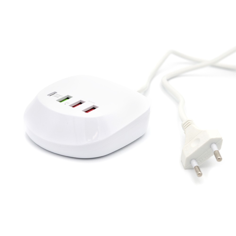 Универсальная платформа для зарядки гаджетов, с возможностью одновременного подключения 4 устройств. Порт Type-C подойдет для ноутбуков и нетбуков, порты USB позволяют при помощи кабеля с нужным типом порта осуществить зарядку мобильных телефонов, планшетов, наушников, часов. Наличие порта с функцией QC позволяет заряжать устройство в ускоренном режиме. Платформа выполнена из негорючего пластика, имеет встроенные компоненты предохраняющие устройства от перепадов напряжения. Длина шнура 105 см.