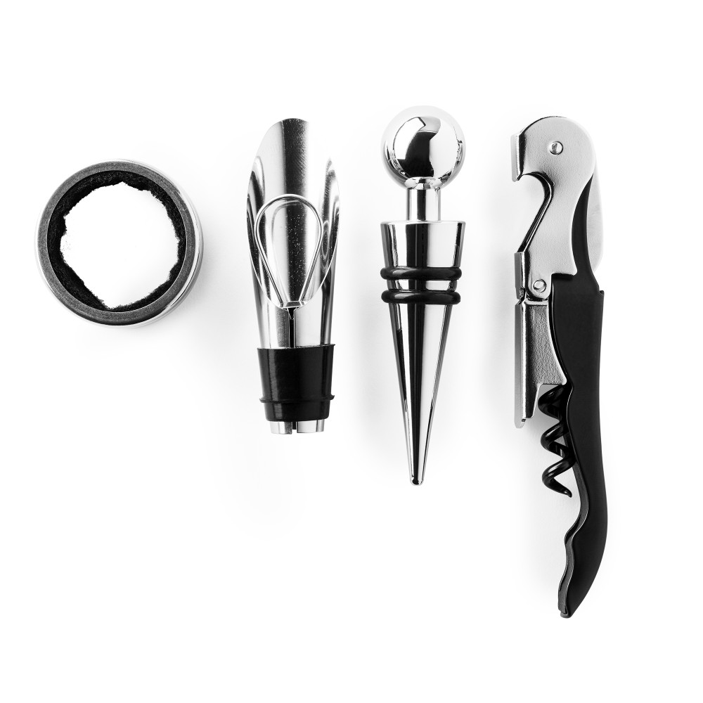 Набор для вина с аксессуарами из нержавеющей стали: штопор с двойным рычагом и складным лезвием, кольцо для капель, носик для наливания и пробка. Представлен в футляре из натуральной пробки с внутренней прокладкой и коробкой с эко-дизайном.