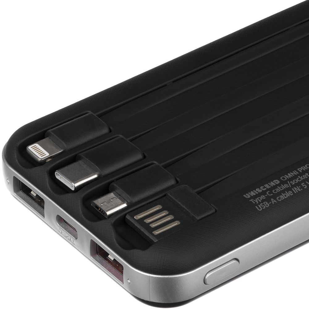 Обновленная модель популярной линейки Omni от бренда Uniscend теперь с поддержкой Power Delivery и возможностью быстрой зарядки смартфона или ноутбука через встроенный кабель Type-C и разъемы USB-A и Type-C (с подходящим для быстрой зарядки проводом). Полный комплект встроенных проводов и цифровой индикатор заряда остались на месте.Кроме увеличенной скорости зарядки модель Omni Pro также получила и более привлекательную внешнюю отделку — покрытие софт-тач на крышках и имитацию металлической рамки по периметру.