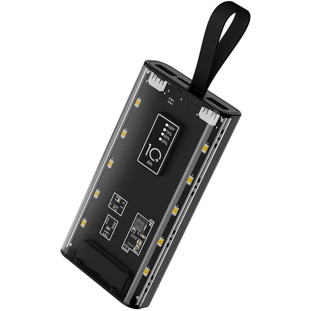 Портативный аккумулятор емкостью 10 000 мАч — это не просто источник энергии, а стильное и футуристичное устройство, которое выделяется своей уникальной конструкцией. Одна часть корпуса выполнена из прозрачного материала, через который прекрасно просматривается современная электронная плата и индикатор заряда батареи, создавая эффект технологичного модуля будущего. Фишкой этого пауэрбанка является встроенная подсветка: при включении он активирует светодиоды, которые мягко светятся через прозрачную крышку, создавая завораживающее световое шоу в нескольких режимах. Это делает устройство не только практичным, но и привлекательным элементом вашего образа, особенно в темное время суток. Дополнительно, силиконовый ремешок обеспечивает надежную защиту и универсальность в использовании — он позволяет носить аккумулятор несколькими способами, будь то в руке, на ремне или в сумке, сохраняя его стильным и удобным в повседневной жизни. Этот аккумулятор станет незаменимым спутником для тех, кто ценит технологичность, эстетичность и функциональность в одном устройстве.