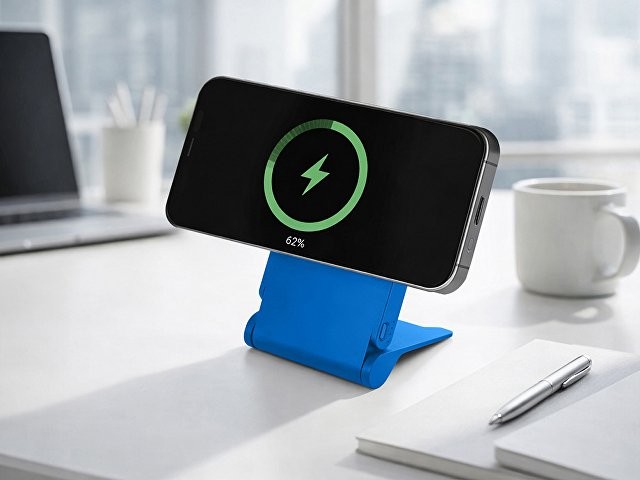 Представляем магнитный пауэрбанк «MagnIQ» на 5 000 мАч с удобной складной подставкой. Это идеальное решение для тех, кто ценит удобство и стиль. Внешний аккумулятор крепится к смартфону за счет встроенных магнитов (подходит для iPhone от 12 версии или для любого смартфона со специальным металлическим кольцом на задней крышке). Пауэрбанк оснащён встроенной складной подставкой, которая обеспечивает комфортное использование смартфона одной рукой как горизонтально, так и вертикально. Больше не нужно беспокоиться о том, что ваш телефон упадет или будет заряжаться лёжа на боку. Просто установите его на подставку и продолжайте использовать устройство без прерывания процесса зарядки. В комплекте зарядный кабель USB-A - USB-C для зарядки пауэрбанка. Кабель для зарядки других устройств от повербанка в комплект не входит. Большое пространство для нанесения логотипов -на фронтальной панели, на задней крышке, на подставке. • беспроводная зарядка 5 Вт • компактный и лёгкий • USB-C работает на вход и на выход • складная подставка для комфортного пользования смартфоном