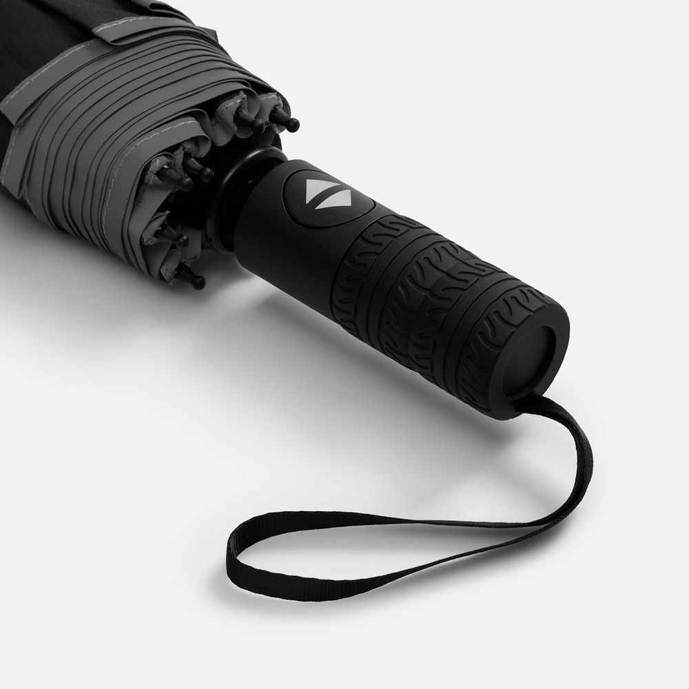 Стильный прочный зонт Tyre не боится ржавчины и нагрузок благодаря каркасу из стекловолокна. Светоотражающий кант делает этот зонт незаменимым спутником в темное время суток, а тактильный рисунок протектора шины на ручке превращает его в продуманный подарок для всех автолюбителей и партнеров этой сферы.