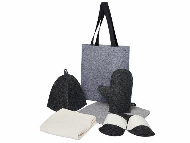 Банный набор "Healing" для настоящего ценителя сауны: коврик, мужской холщовый килт, рукавица, шапка, двуцветные тапочки — всё в стильном фетровом шоппере.