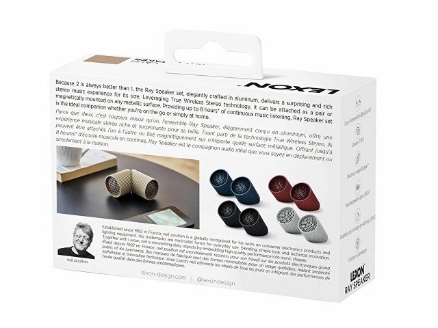 Ray Speaker — это дуэт магнитных Bluetooth®-колонок, удостоенных наград Red Dot Design Award и IF Design Award. Обеспечивая захватывающий стереозвук благодаря технологии True Wireless Stereo, эти колонки легко крепятся друг к другу или к любой магнитной поверхности, что делает их идеальными для использования дома или в дороге. Помимо прослушивания музыки, Ray Speaker позволяет совершать звонки без помощи рук и дистанционно делать селфи. Благодаря аккумулятору, работающему до 8 часов, и элегантному алюминиевому корпусу, они добавят современный штрих в ваш интерьер, а степень водонепроницаемости IPX4 позволяет использовать их на улице. Доступны различные цвета, которые дополнят ваш стиль. - Комплект магнитных динамиков Bluetooth® - Совместимость с TWS для стереозвучания - Микрофон без помощи рук - Управление селфи - Удобный для использования на открытом воздухе IPX4 - Срок службы батареи: до 8 ч - Время зарядки: 3 ч - Зарядка через кабель USB C в комплекте - Питание: USB-адаптер питания 5 В в комплект не входит