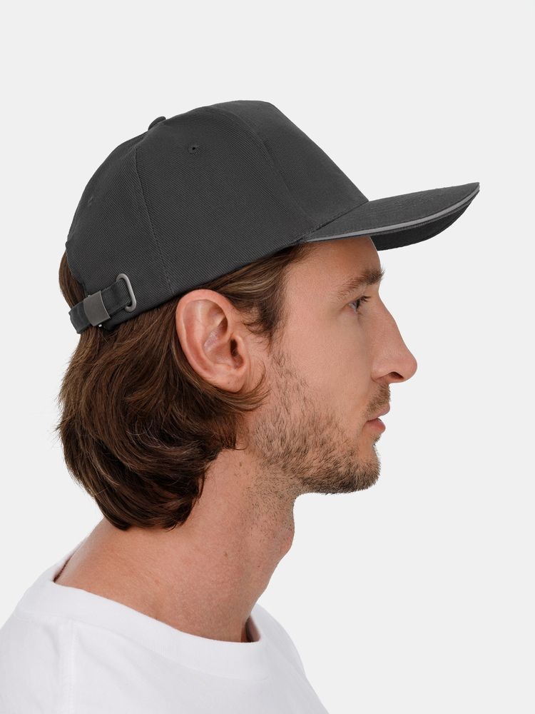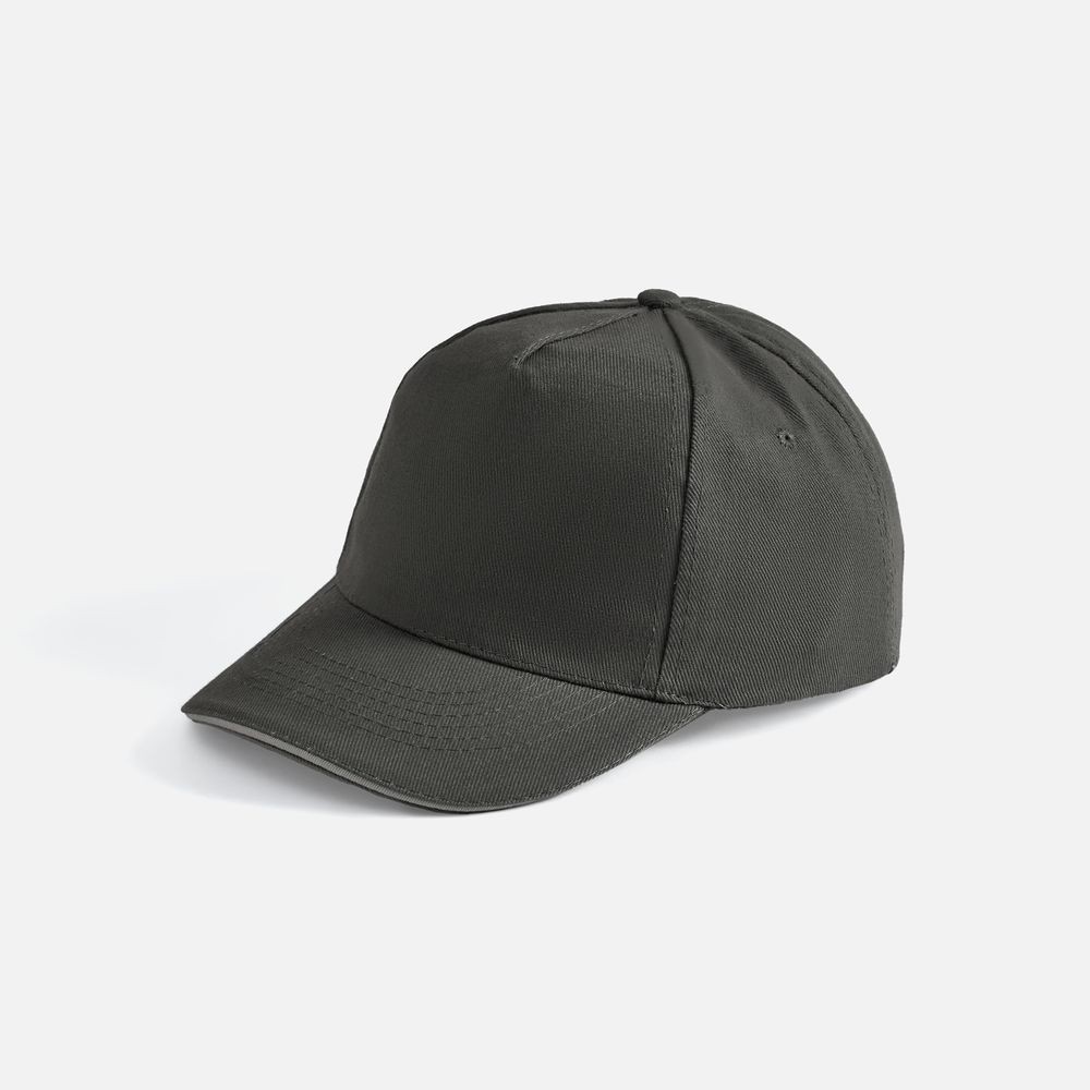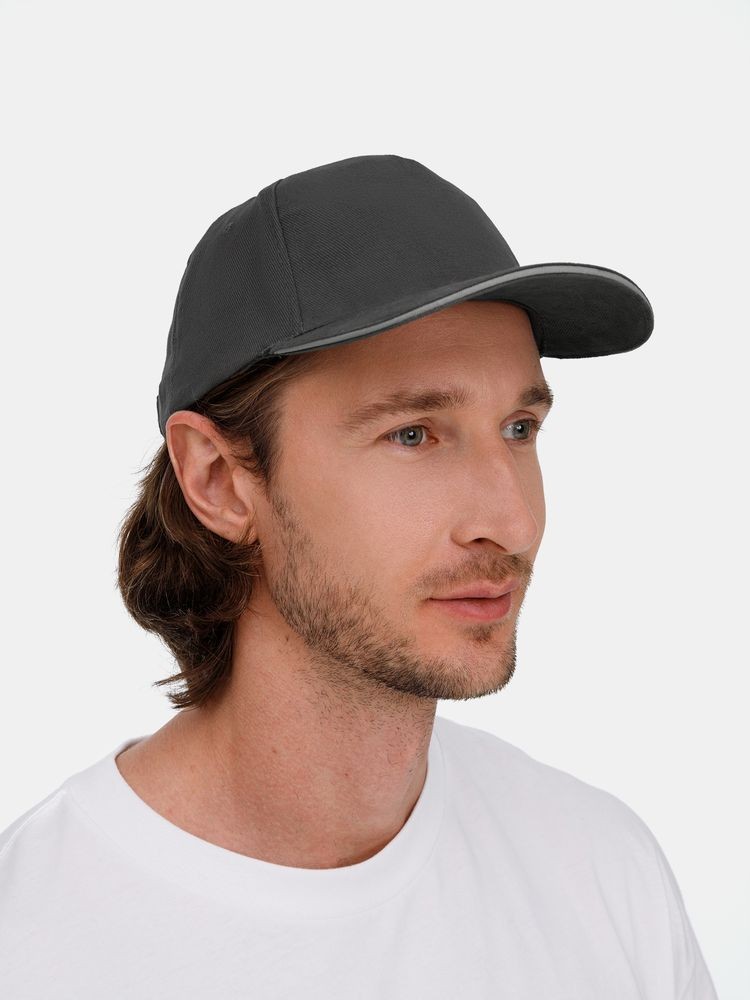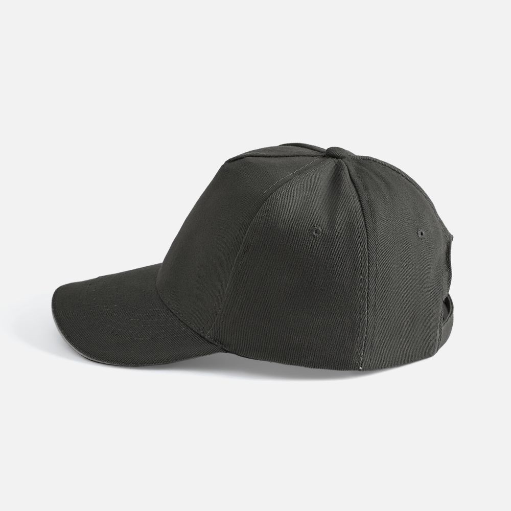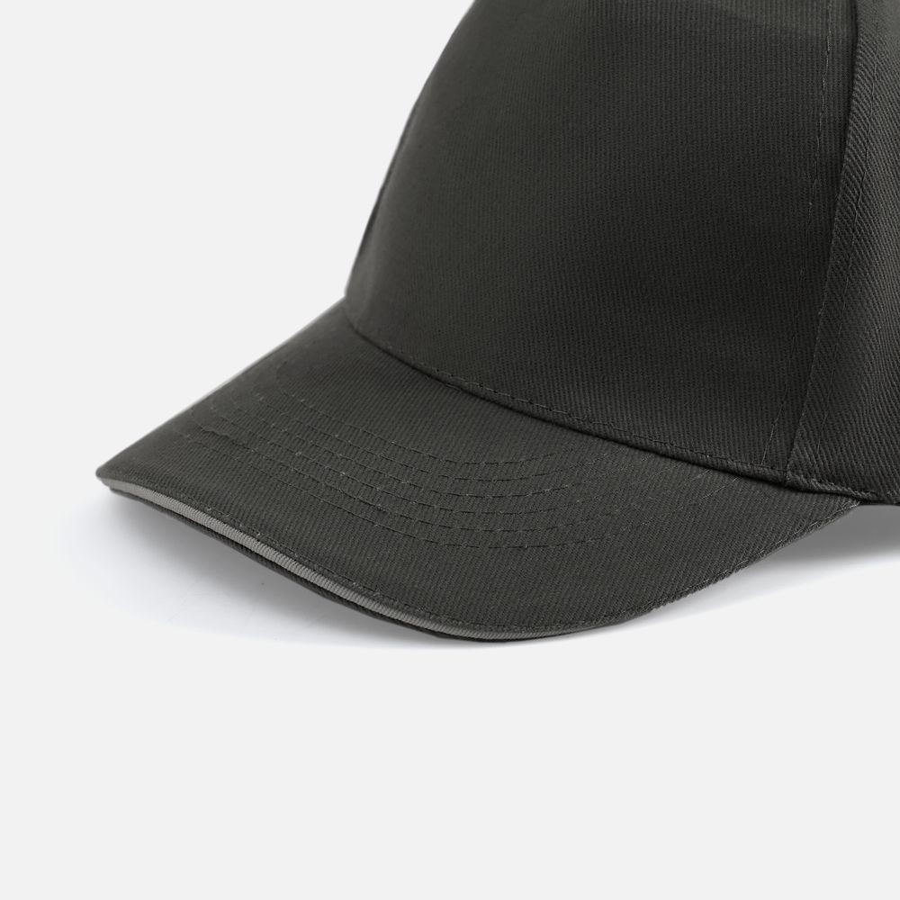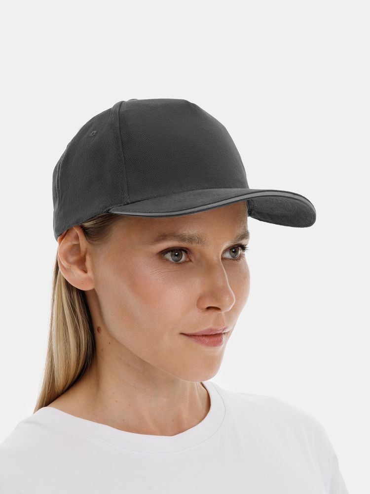 Модель бейсболки с 5-ю клиньями без лобового шва из плотного чесаного хлопка.