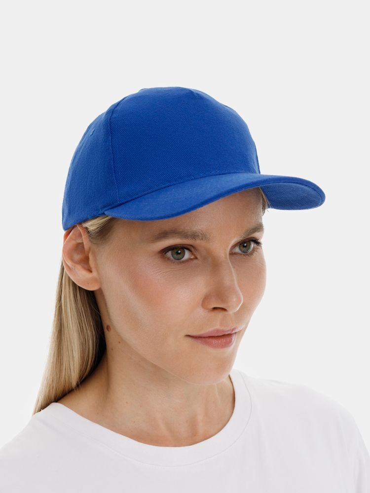 Модель бейсболки с 5-ю клиньями без лобового шва из плотного чесаного хлопка.