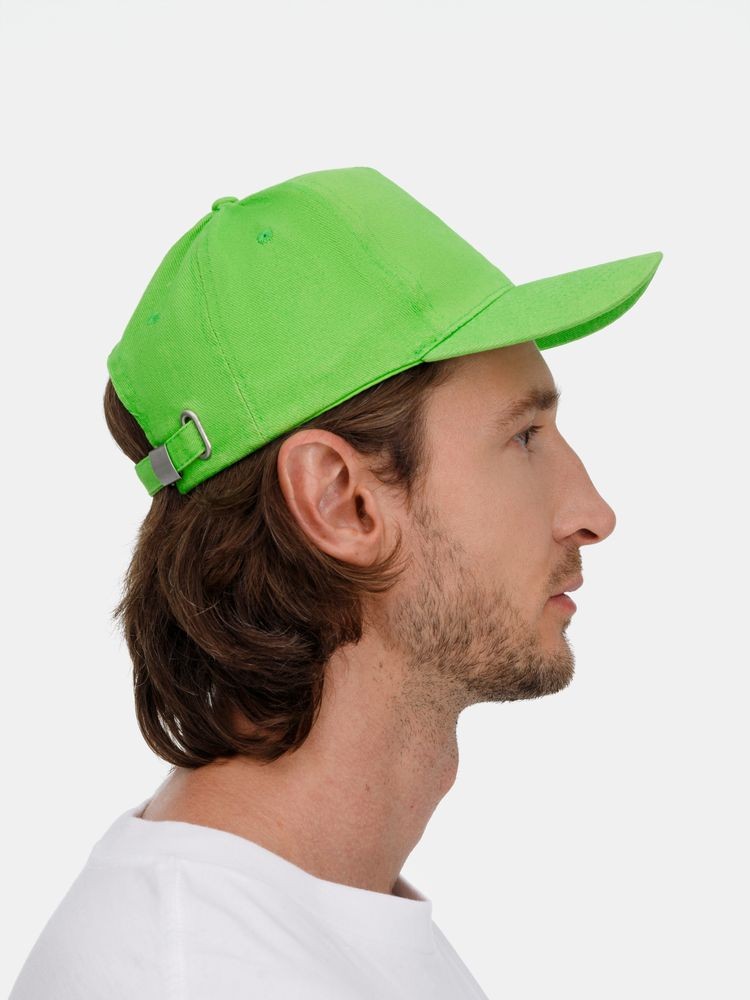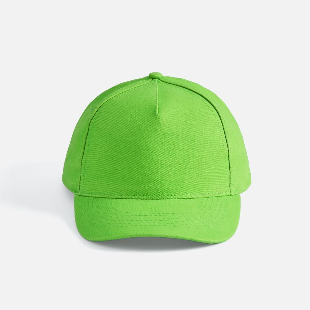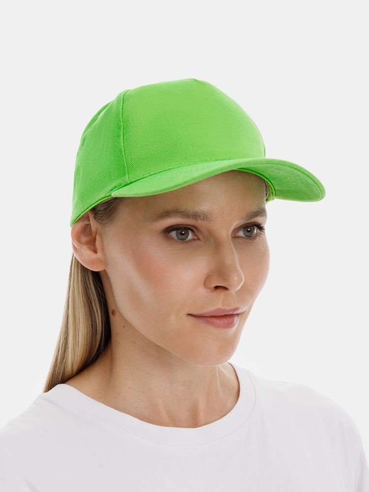 Модель бейсболки с 5-ю клиньями без лобового шва из плотного чесаного хлопка.