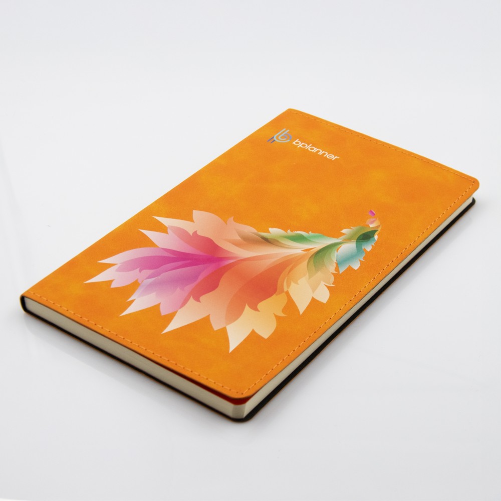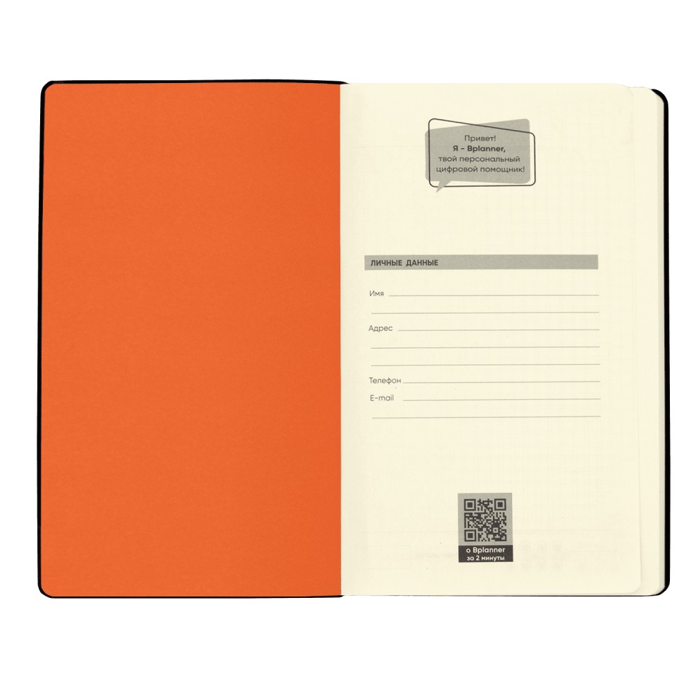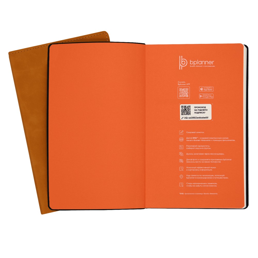 Bplanner. 05 — абсолютно новая модель в линейке Bplanner. Это бизнес-блокнот с недатированным тонированным блоком в клетку. Блок имеет ряд особенностей: наличие титульного листа с возможностью добавления личных данных и контактной информации, трекер воды и шагов на каждой странице и 3 разворота для заметок в конце блокнота. Обложка изготовлена из экокожи Nubuk-touch и имеет прострочку по краю в цвет материала. Фактура материала напоминает замшу или нубук. У блокнотов цветной форзац и нахзац. Блокнот подходит для УФ-печати и тиснения логотипа компании. На форзаце расположен qr-код, который активирует годовой доступ к мобильному приложению.