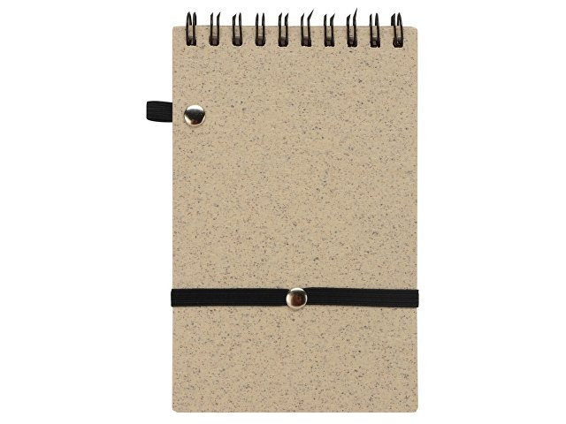 Блокнот с обложкой из переработанной пшеницы и пластика. Блок состоит из 60 листов переработанной бумаги белого цвета. Крепление - пружина. Дополнен петлей для ручки и горизонтальной резинкой.