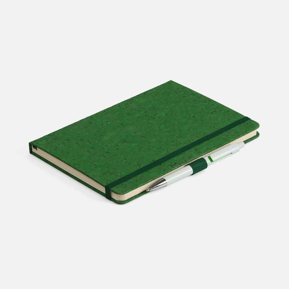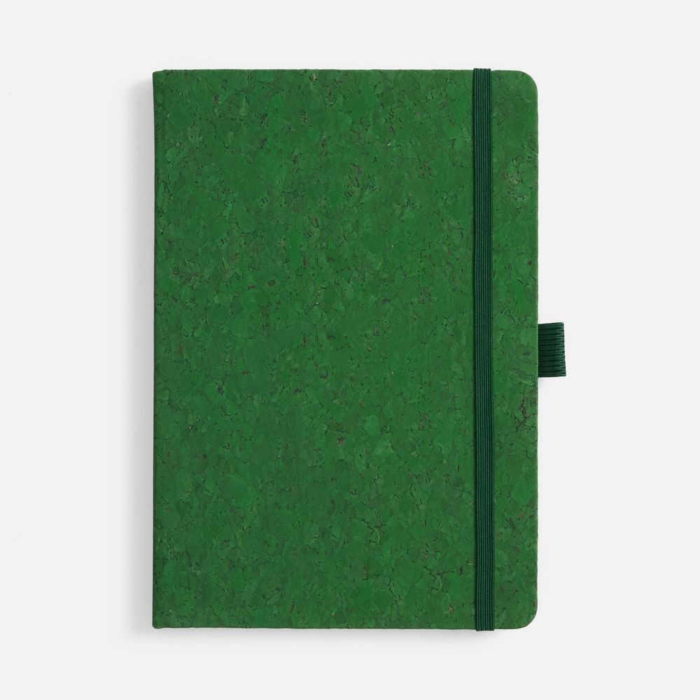 Блокнот с твердой обложкой из натуральной окрашенной пробки, дополнен петлей-резинкой для ручки, ляссе и резинкой в цвет обложки.