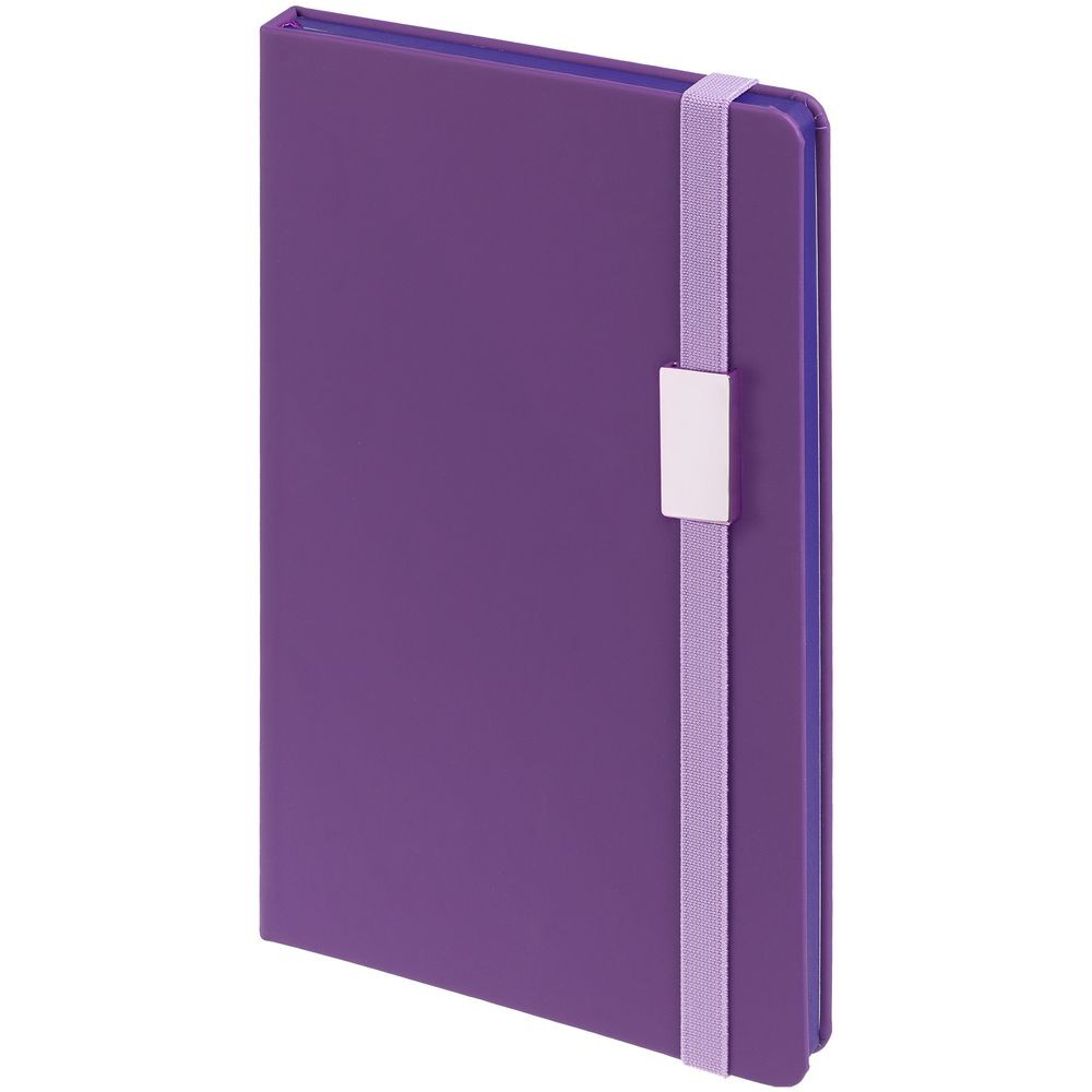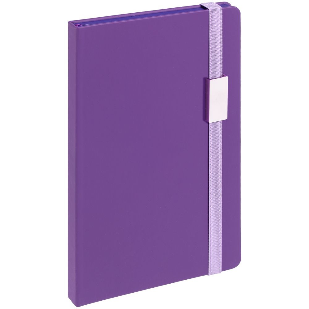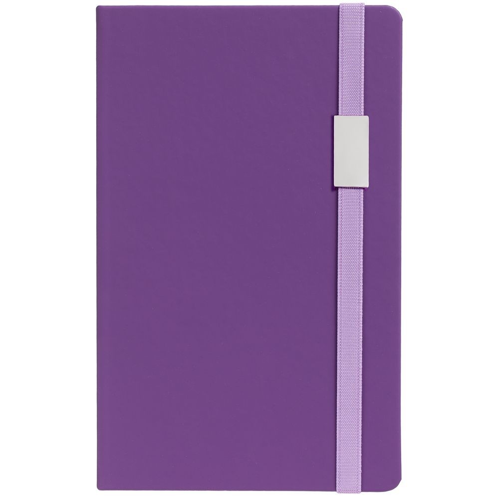 Блокнот в твердой обложке, выполнен из материала Soft Touch, фиолетовый UU, дополнен резинкой и ляссе в цвет обложки.