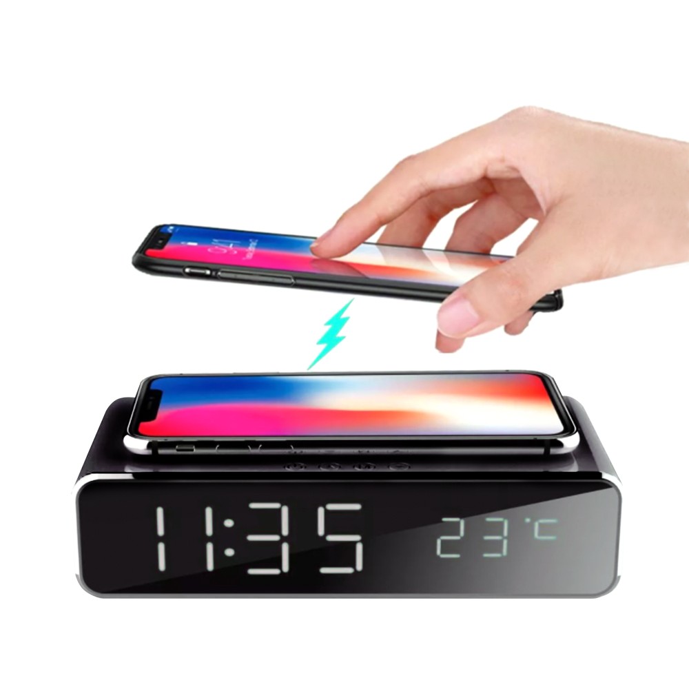 Часы имеют простой и элегантный дизайн с LED дисплеем, на котором отображается комнатная температура. Устройство позволяет устанавливать три разных времени будильника для вашего удобства. Наверху часов расположен модуль для беспроводной зарядки с мощностью 5 Вт, что позволяет быстро и удобно заряжать ваш смартфон. Размеры упаковки часов составляют 17.4 x 10.4 x 5 см.