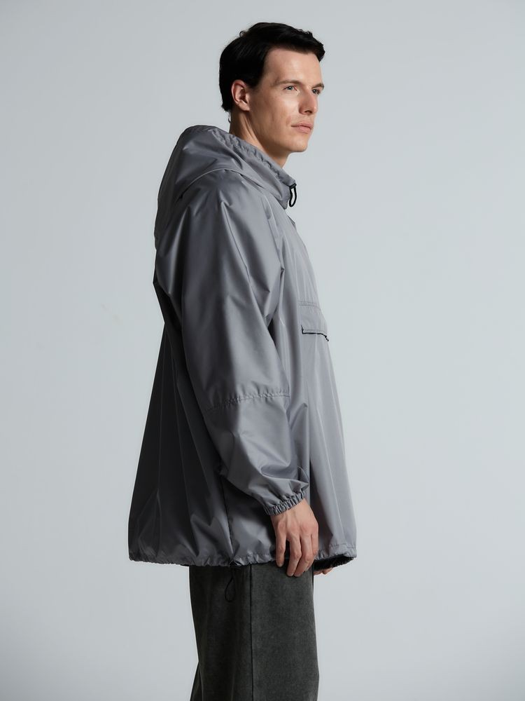 Дождевик-анорак с капюшоном и карманом на молнии спереди. Выполнен из ткани дюспо с матовой поверхностью — легкой, мягкой на ощупь, но устойчивой к повреждениям. Она не шелестит и практически не мнется. Благодаря пропитке дюспо обладает отличными водоотталкивающими и ветрозащитными свойствами.