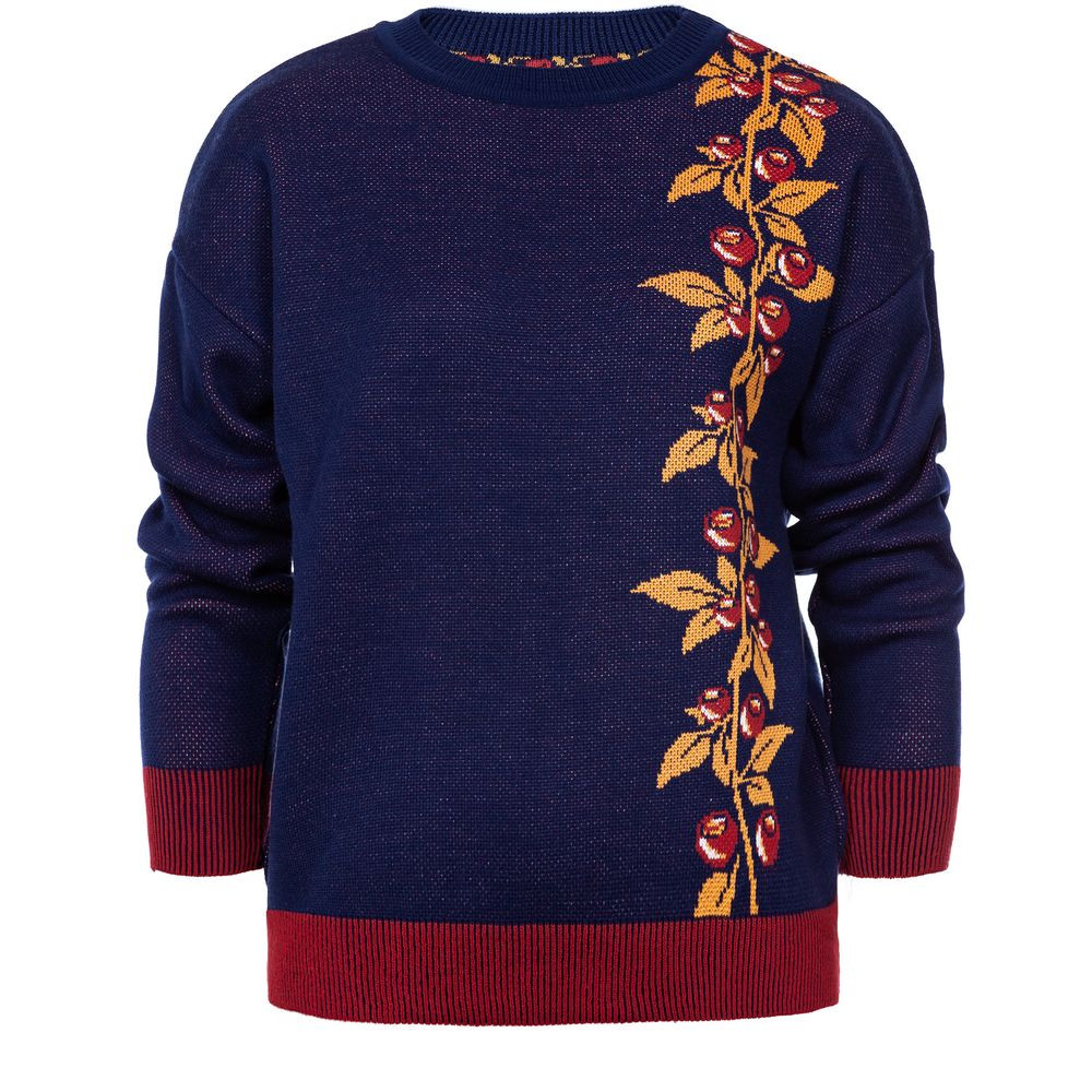 Небольшая, но невероятно ароматная и привлекательная ягода брусника славится целой палитрой оттенков. Насыщенный брусничный — один из популярных цветов грядущей весны! Джемпер с круглым вырезом и жаккардовым рисунком. Ворот, манжеты и низ изделия выполнены резинкой.