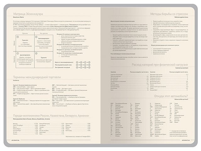 Элегантный датированный ежедневник "Megapolis Color" от Bruno Visconti идеально подходит для организации рабочего дня и ведения важных записей. Обложка из искусственной кожи с приятным на ощупь покрытием Soft Touch и обрез в тон создают гармоничный образ. Внутри – блок из бежевой бумаги плотностью 70 г/кв.м с разделами для планирования, календарем на 2026-2027 год и полезной справочной информацией. Для удобства навигации предусмотрена закладка-ляссе шириной 7 мм в цвет обложки.
