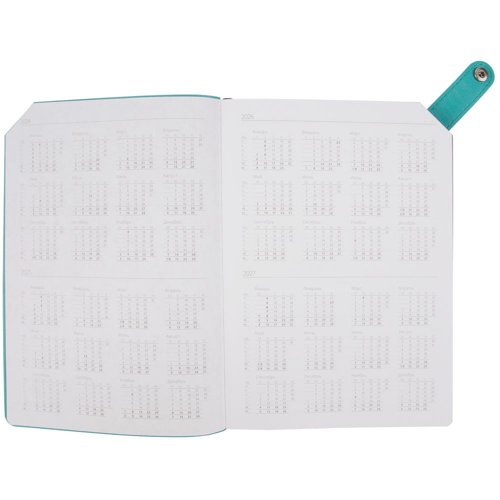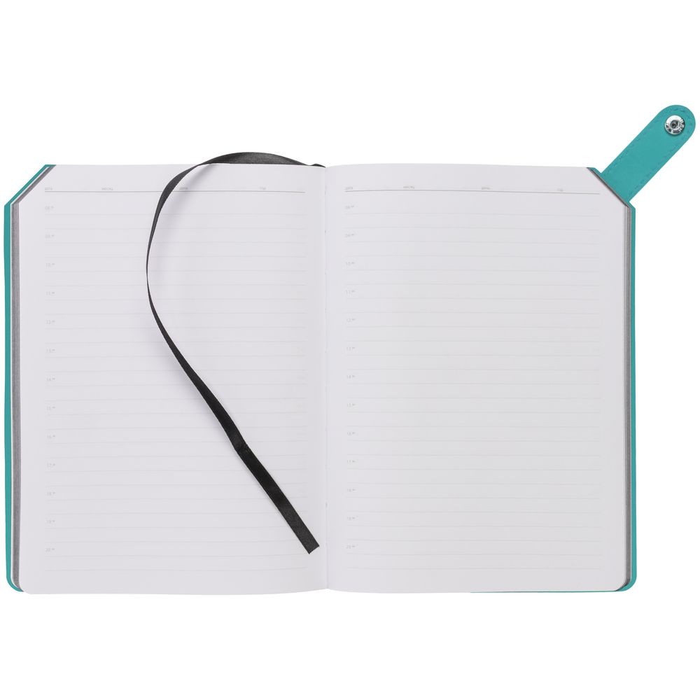 Ежедневник с гибкой обложкой и тонированным обрезом. Выполнен из материала Latte, морская волна II, дополнен черным ляссе.