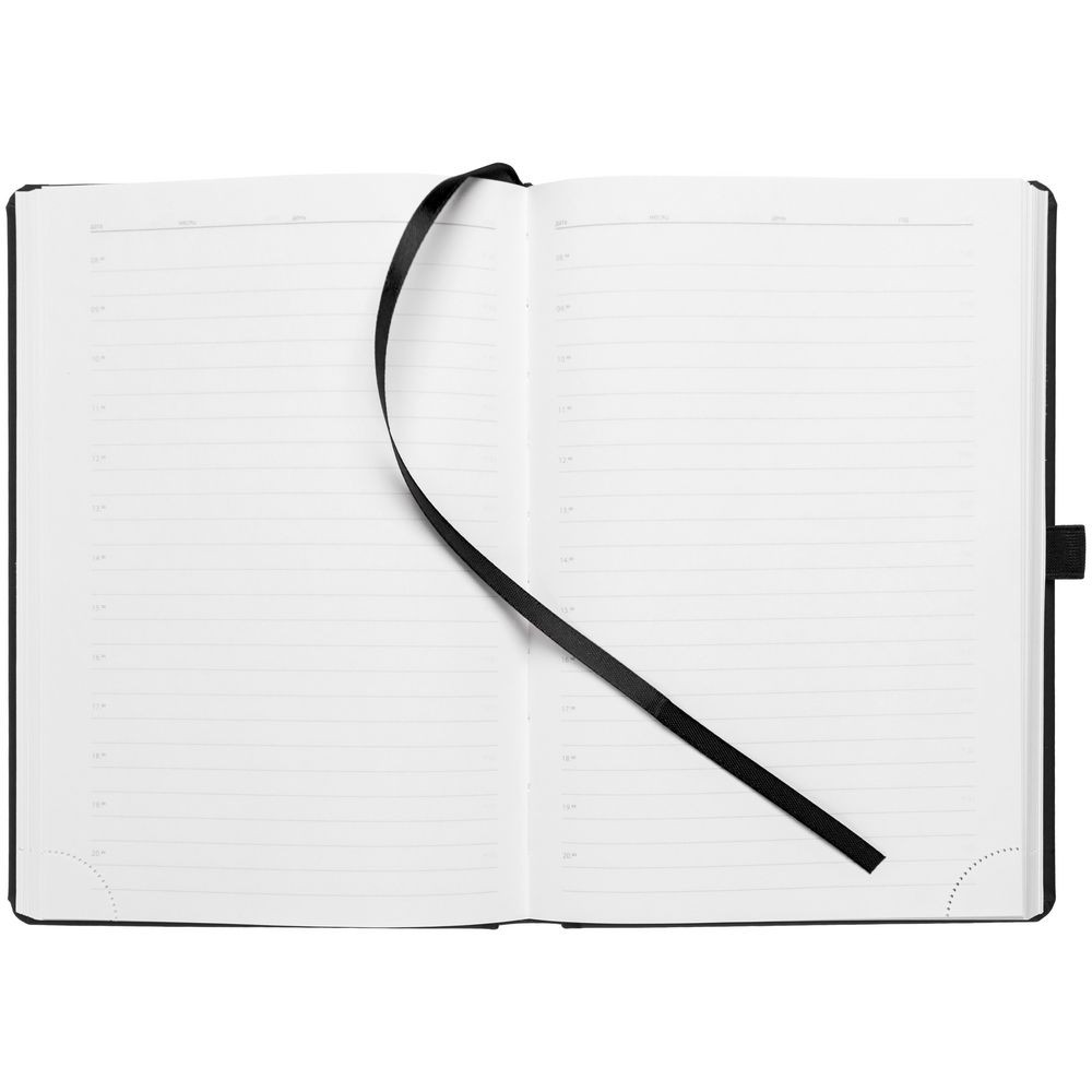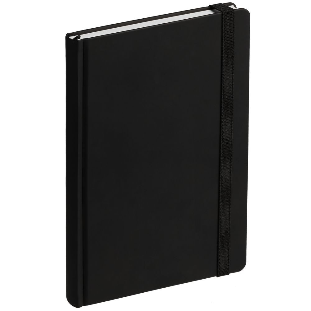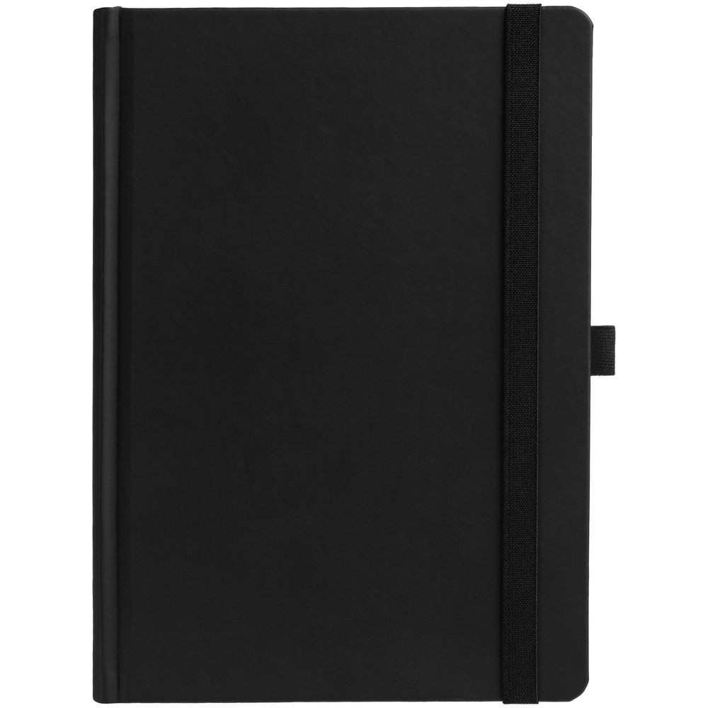 Ежедневник с твердой обложкой без поролона, выполнен из материала Soft Touch, черный АА, дополнен резинкой шириной 1 см, петлей-резинкой для ручки, капталом и ляссе черного цвета.