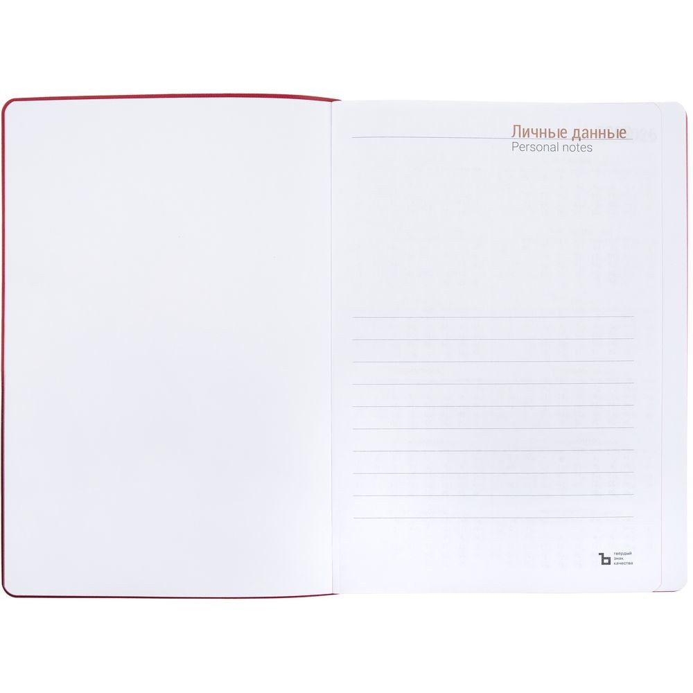 Гибкая обложка ежедневника выполнена из материала Latte, красный РР. Внутри корешка — специальное место для крепления ручки размером до 15х0,9 см.