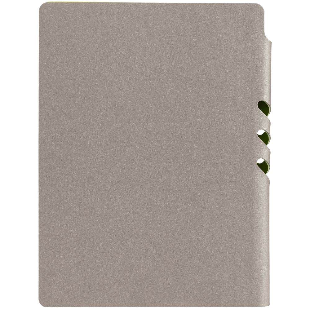 Гибкая обложка выполнена из материала Velour Melange, серый СС и Latte, светло-зеленый (внутренняя часть обложки). Внутри корешка — специальное место для крепления ручки размером до 15х0,9 см.