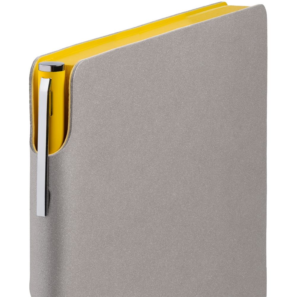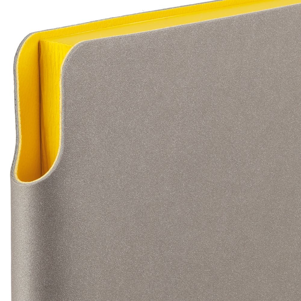 Гибкая обложка выполнена из материала Velour Melange, серый СС и Latte, желтый КК (внутренняя часть обложки). Внутри корешка — специальное место для крепления ручки размером до 15х0,9 см.