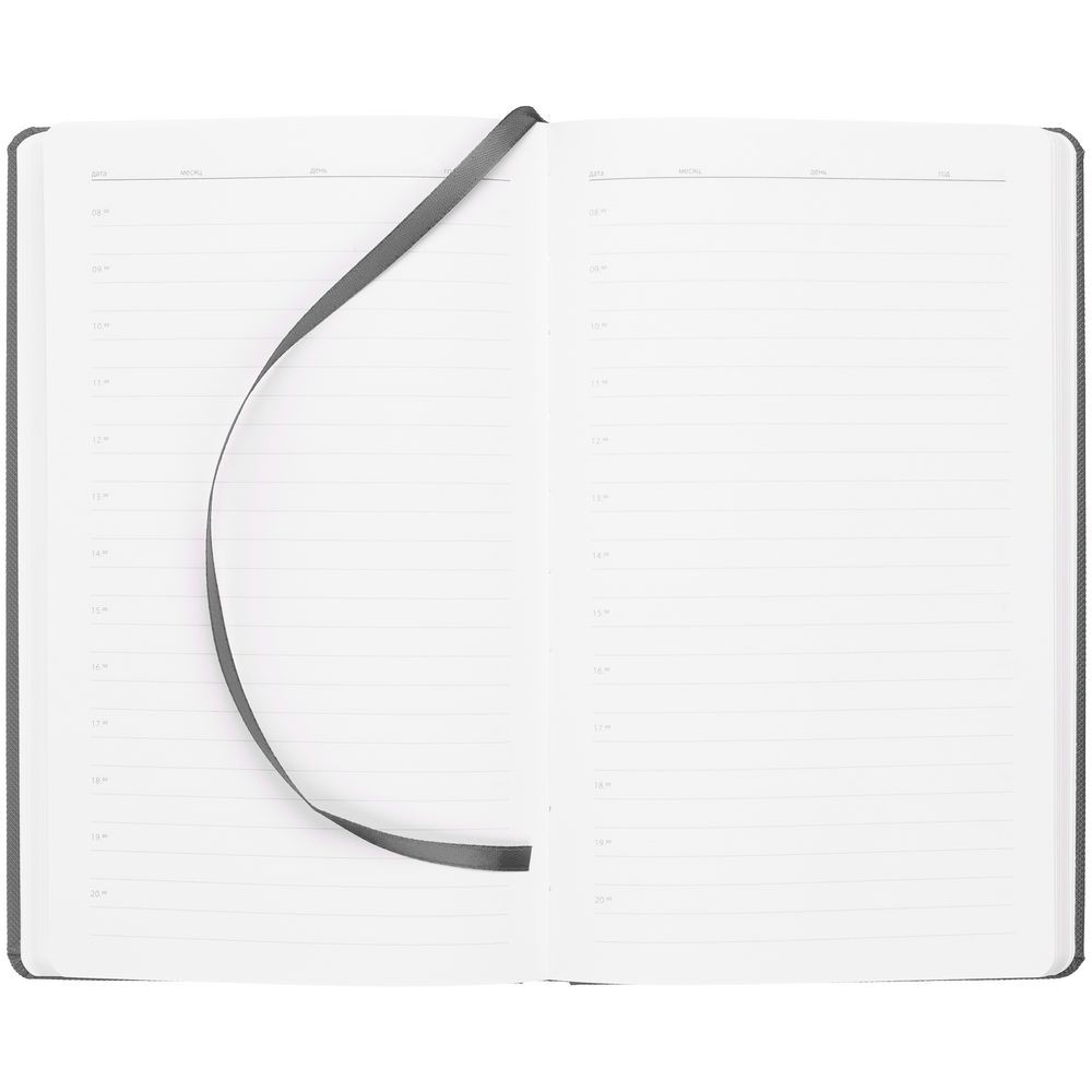 Ежедневник с твердой обложкой, выполнен из материала Canyon, темно-серый ЕЕ, дополнен ляссе в цвет обложки.