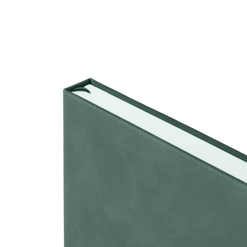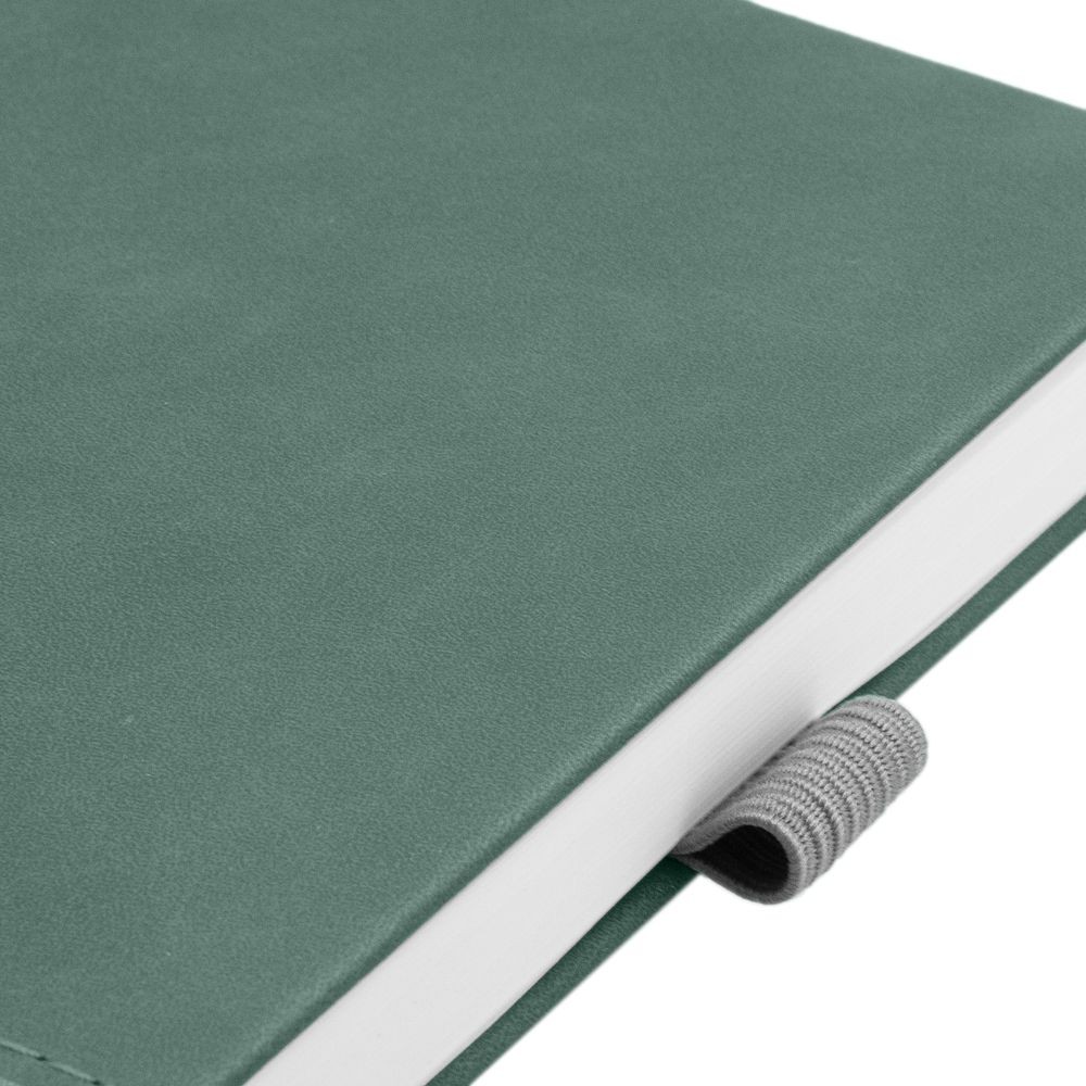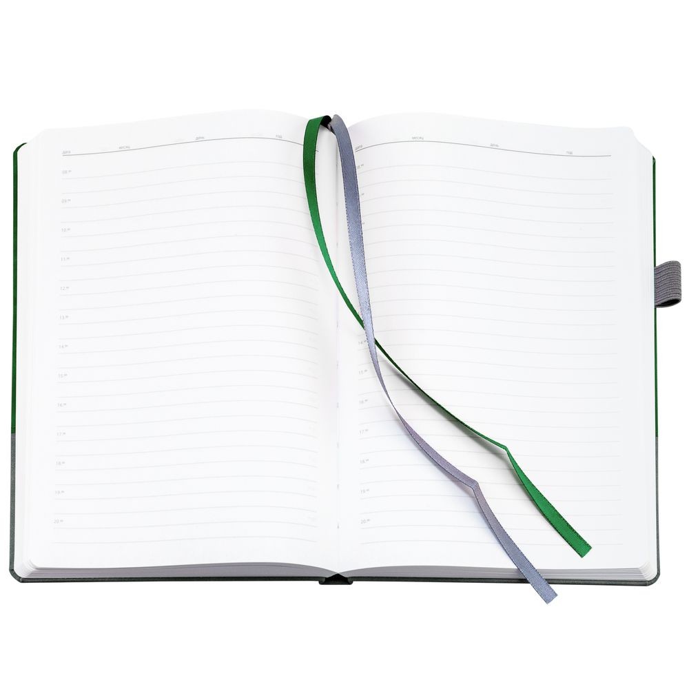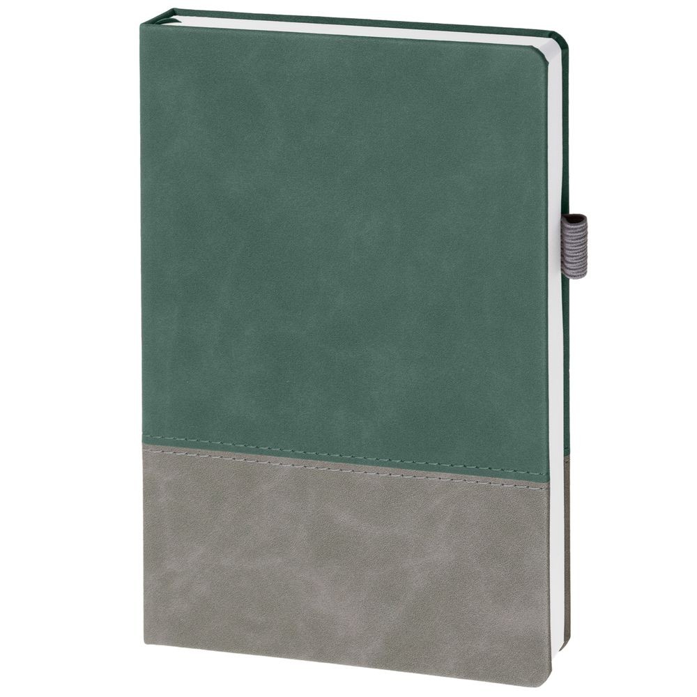 Ежедневник с твердой обложкой, без поролона, со сшивкой материалов Nubuck Touch, серый СС, и Nubuck Touch зеленый FF, дополнен двойным ляссе и петлей-резинкой для ручки.
