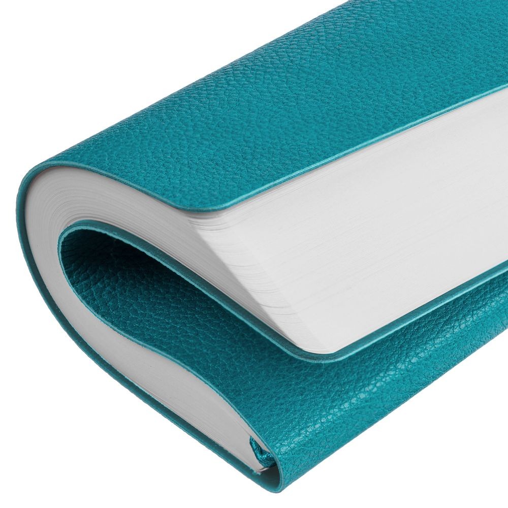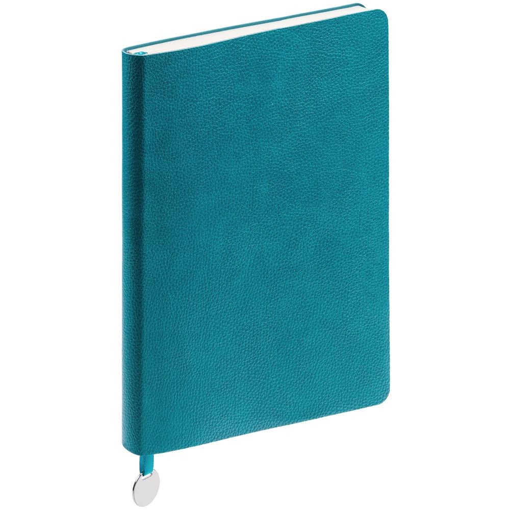 Ежедневник с гибкой обложкой, выполнен из материал La Fite, цвет морской волны II, дополнен ляссе в цвет обложки с металлическим шильдом.