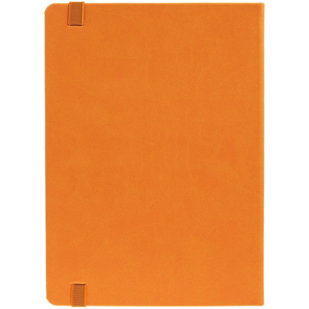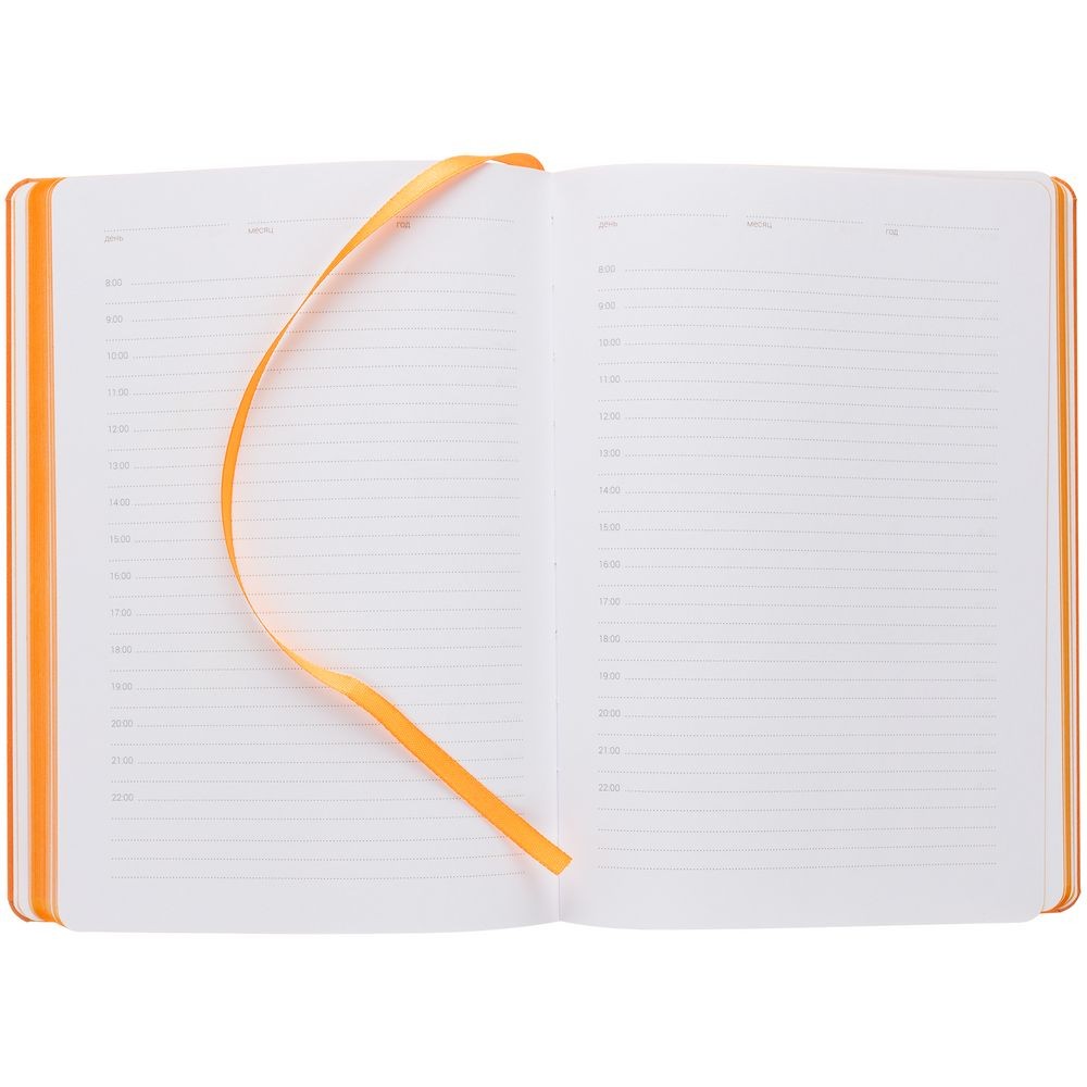 Ежедневник с твердой обложкой, выполнен из материала Latte, оранжевый ОО, обрез оранжевого цвета, дополнен резинкой и ляссе оранжевого цвета.