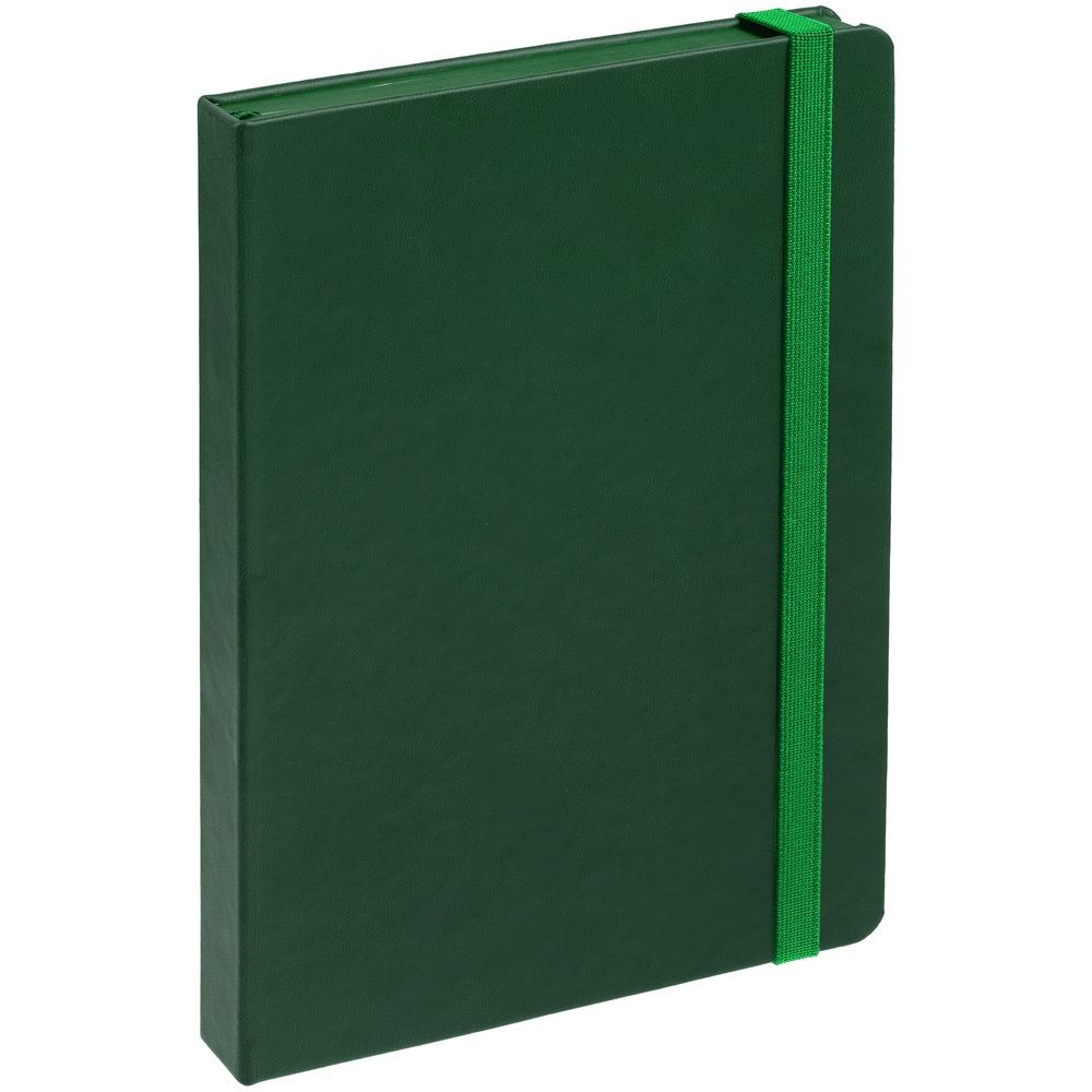Ежедневник с твердой обложкой, выполнен из материала Latte, зеленый FF, обрез зеленого цвета, дополнен резинкой и ляссе зеленого цвета.
