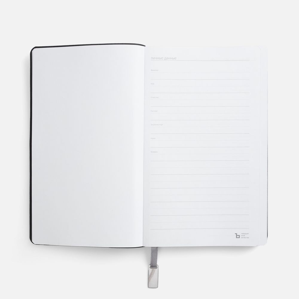 Ежедневник с гибкой обложкой, выполнен из материала Petrus, голубой JJ, дополнен серым ляссе с металлическим шильдиком.