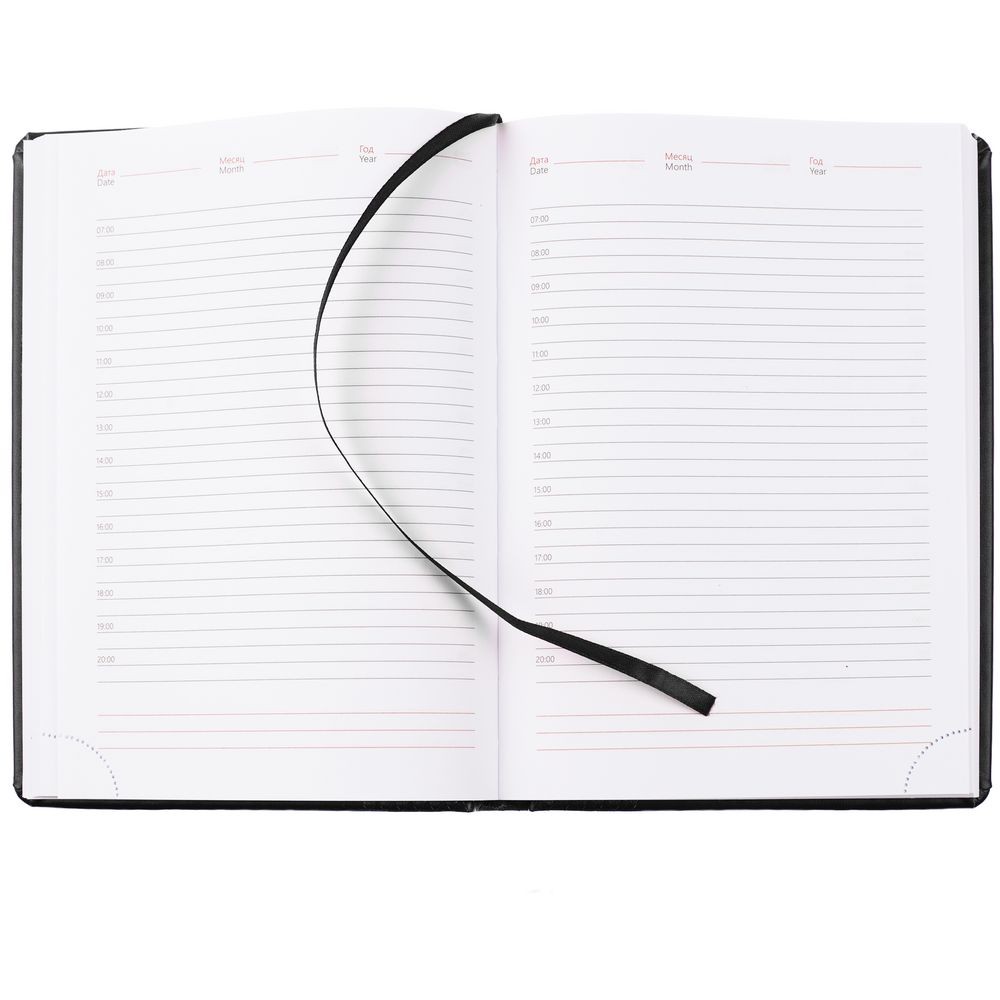 Ежедневник с твердой обложкой, выполнен из материала Waltz, черный АА, дополнен ляссе в цвет материала.