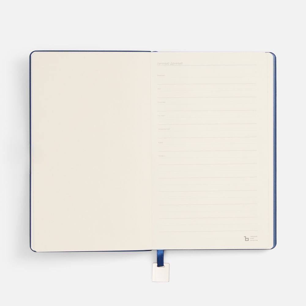 Ежедневник с гибкой обложкой, выполнен из материалов Soft Touch Pearl, синий НН, и Latte, темно-синий (внутренняя часть обложки), дополнен ляссе в цвет обложки с металлическим шильдиком.