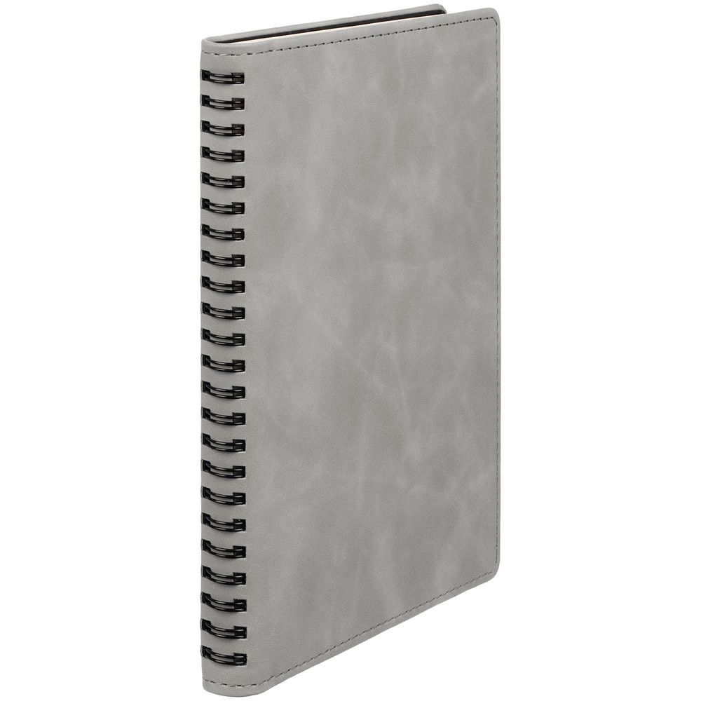 Ежедневник с блоком на пружине в твердой обложке, выполнен из материалов Nubuk Touch, серый СС и Soft Touch, черный AA.