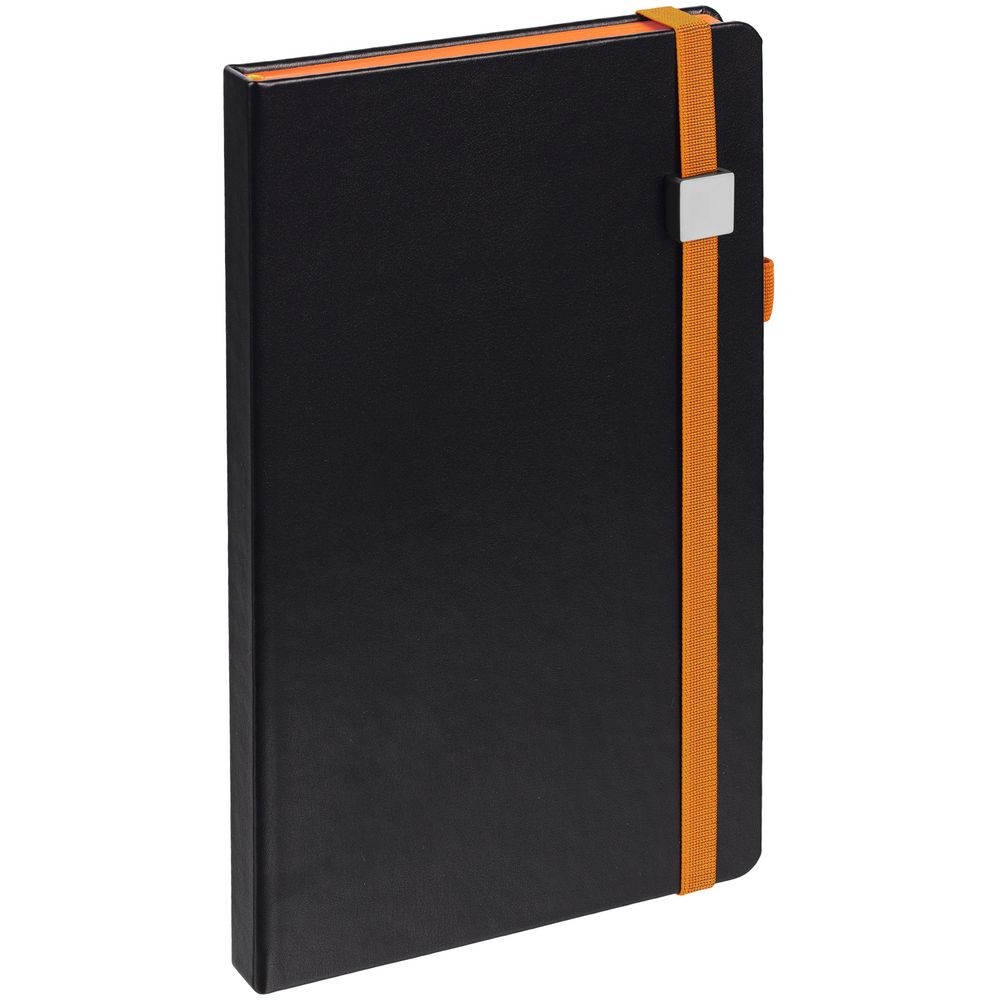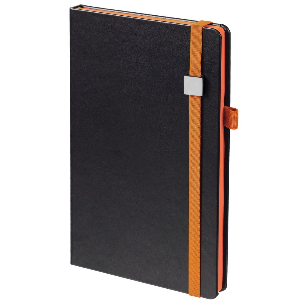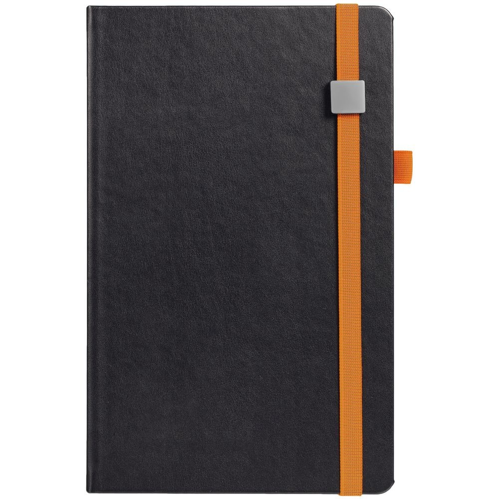 Ежедневник с полутвердой обложкой, выполнен из материала Waltz, черный АА, дополнен оранжевой резинкой с металлическим шильдом и ляссе.