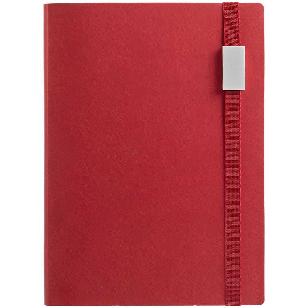 Ежедневник с гибкой обложкой, выполнен из материала Latte, красный PP, дополнен резинкой шириной 1 см с металлическим шильдом, капталом и ляссе красного цвета.
