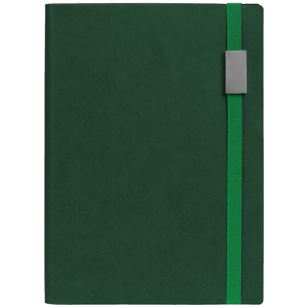 Ежедневник с гибкой обложкой, выполнен из материала Latte, зеленый FF, дополнен резинкой шириной 1 см с металлическим шильдом, капталом и ляссе зеленого цвета.