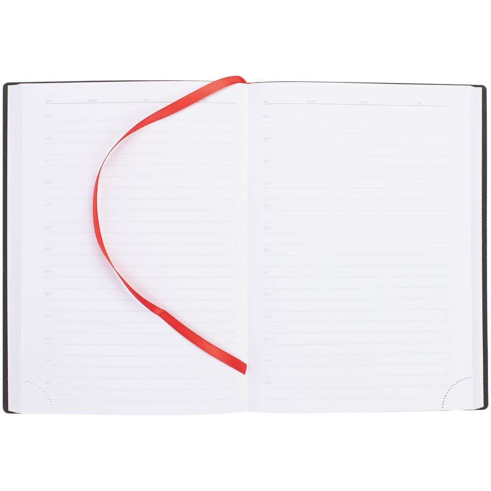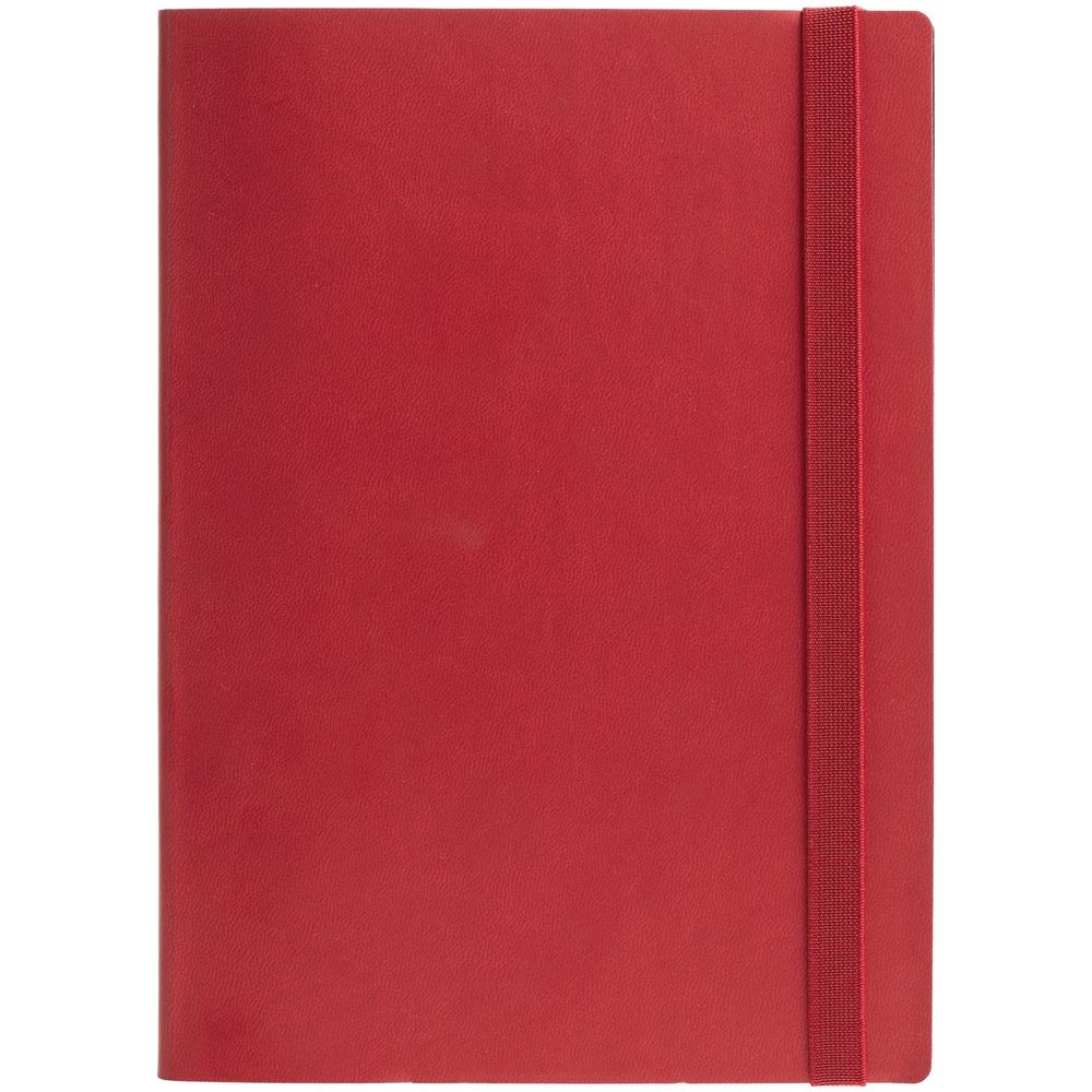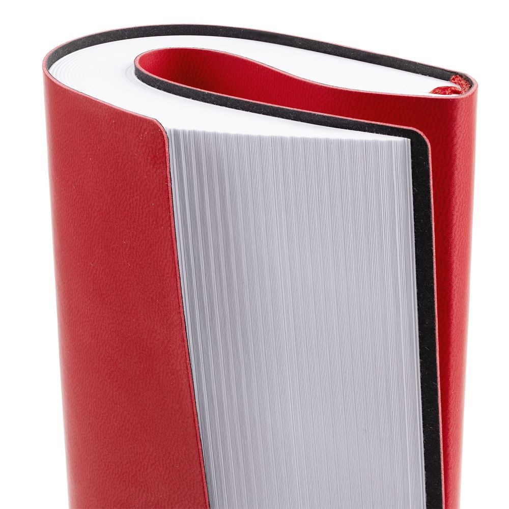 Ежедневник с гибкой обложкой выполнен из материала Latte, красный РР, и дополнен резинкой шириной 1 см, капталом и ляссе красного цвета.