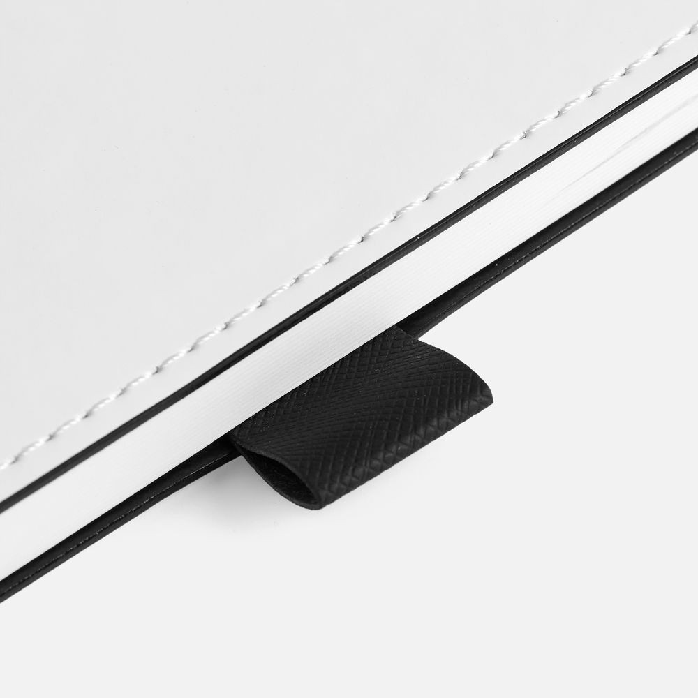 Гибкая обложка, материал обложки — Soft Touch, белый BB и Latte, черный АА; материал петли для ручки — Nice Touch, черный АА. Срез обложки окрашен в черный цвет.