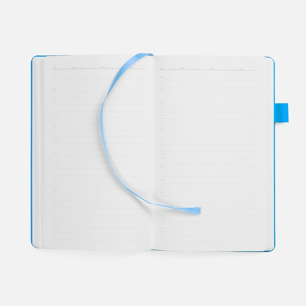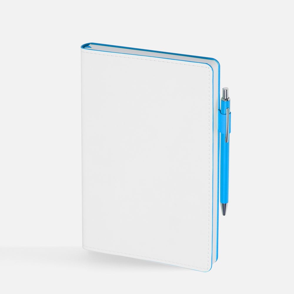 Гибкая обложка, материал обложки — Soft Touch, белый BB и Latte, голубойJJ; материал петли для ручки — Nice Touch, голубойJJ. Срез обложки окрашен в голубой цвет.