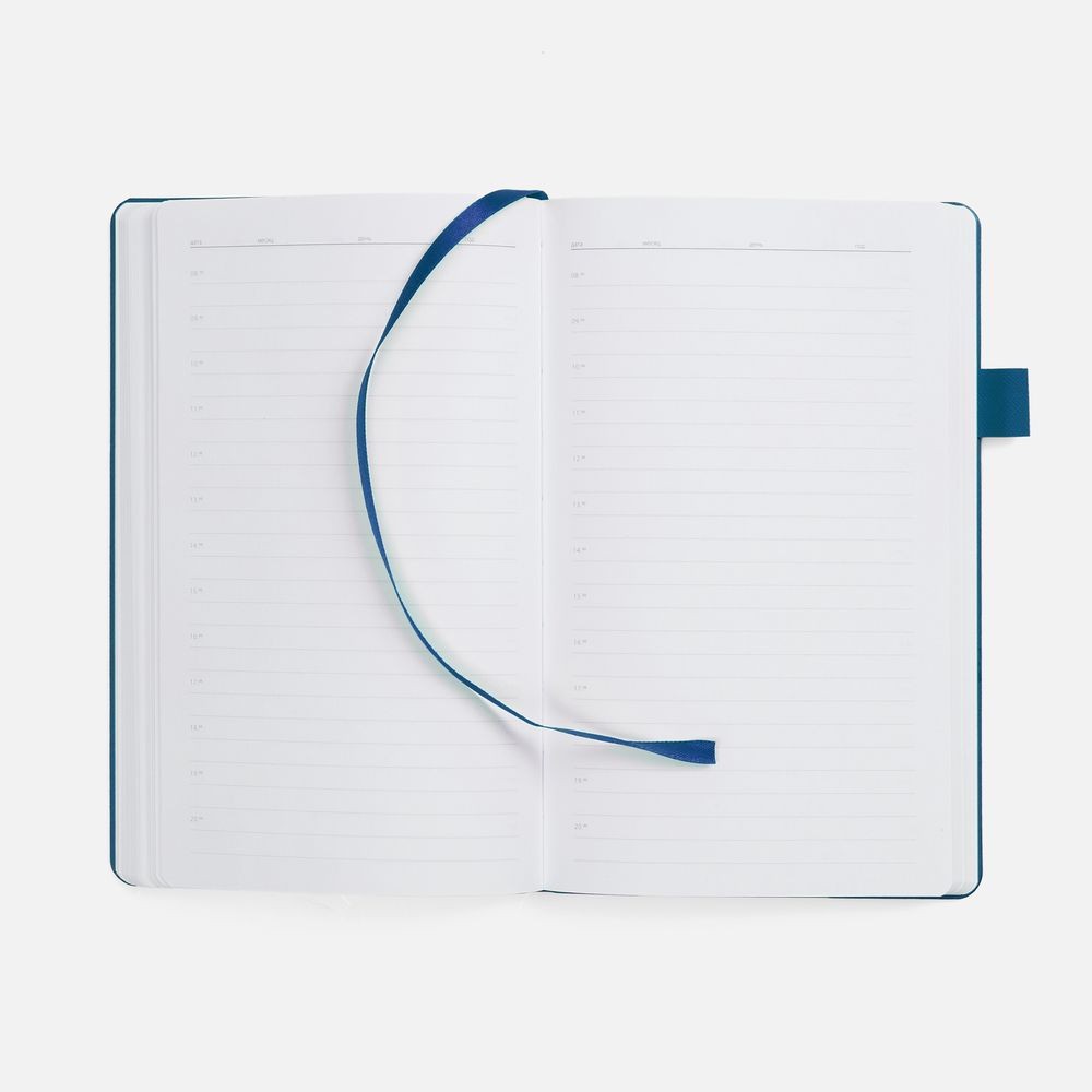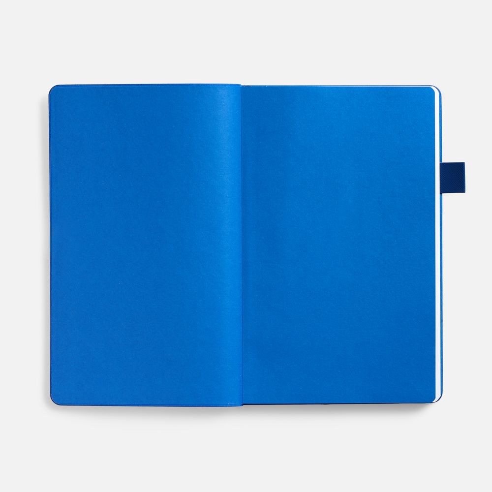 Гибкая обложка, материал обложки — Soft Touch, белый BB и Latte, синий НН; материал петли для ручки — Nice Touch, синий НН. Срез обложки окрашен в синий цвет.