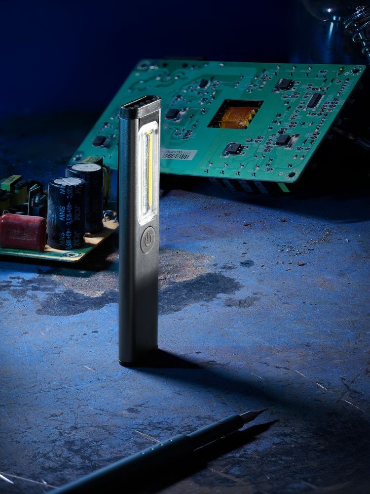 Карманный фонарик-факел, который работает от аккумулятора.Плавная регулировка яркости осуществляется удержанием центральной кнопки при включенном устройстве — это позволяет точно адаптировать освещение под рабочие условия. Магнит в основании фонарика дает возможность зафиксировать фонарик на металлической поверхности и освободить руки для выполнения задач.